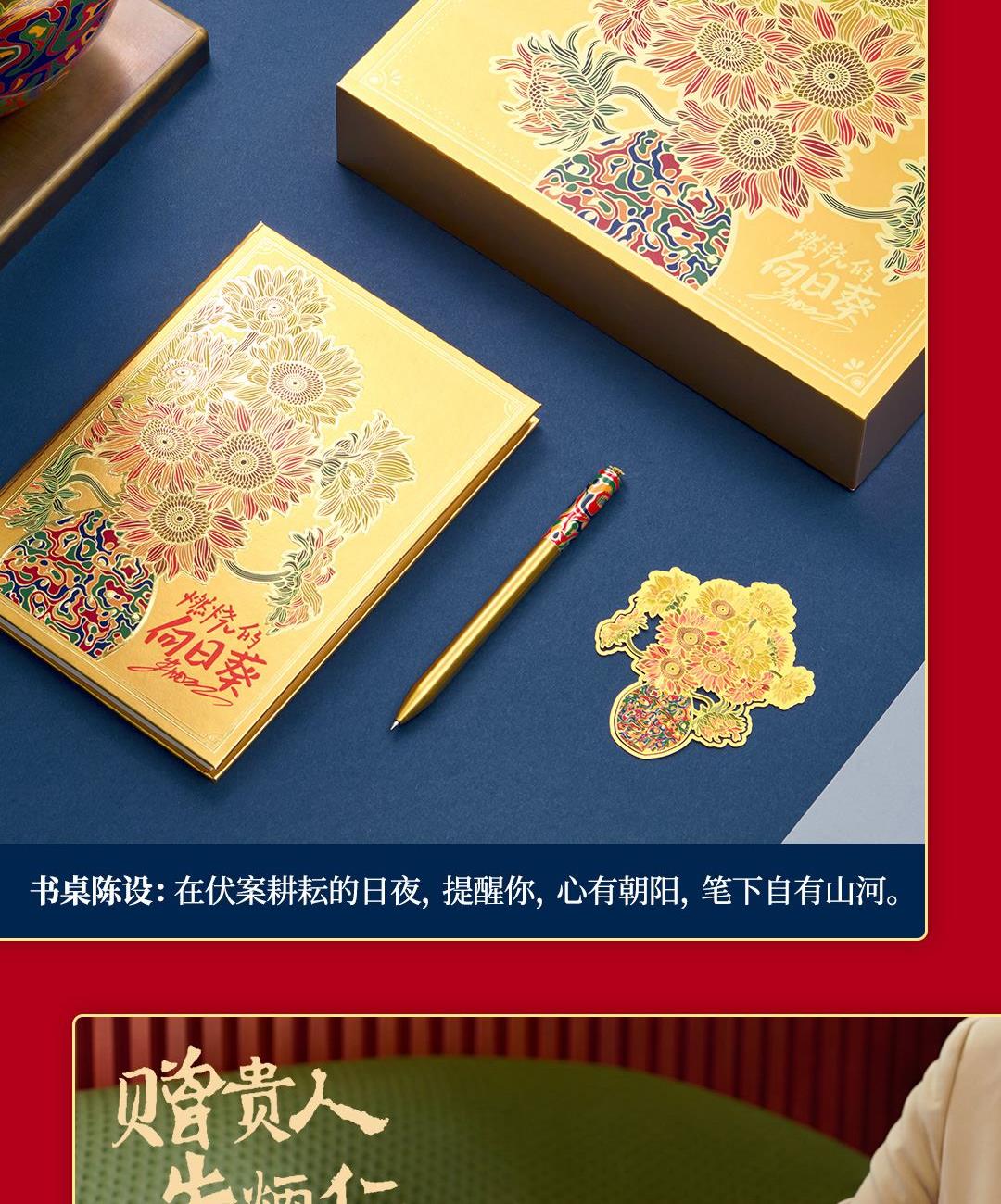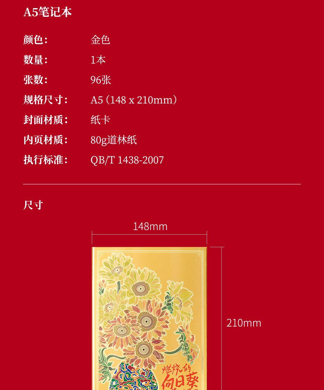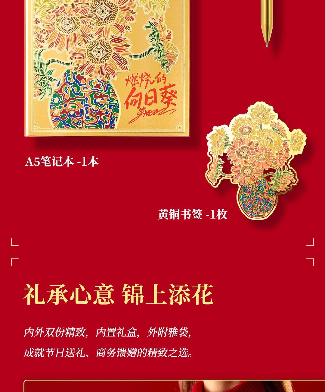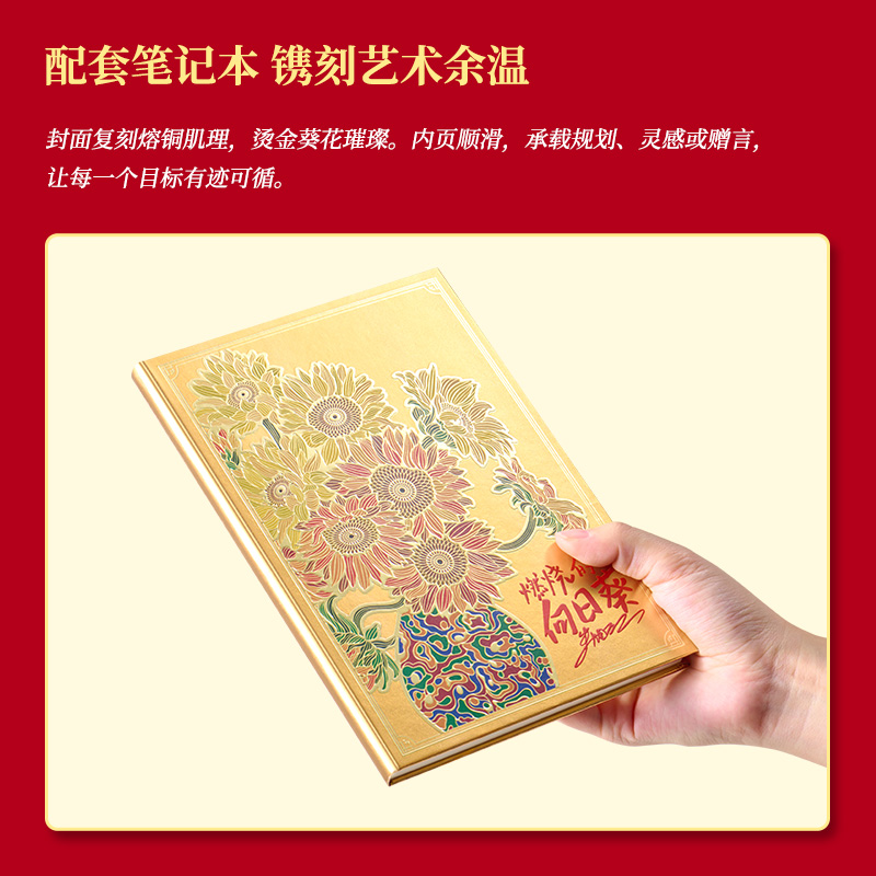 4、配套筆記本*1,封面復(fù)刻熔銅肌理,燙金葵花璀璨。