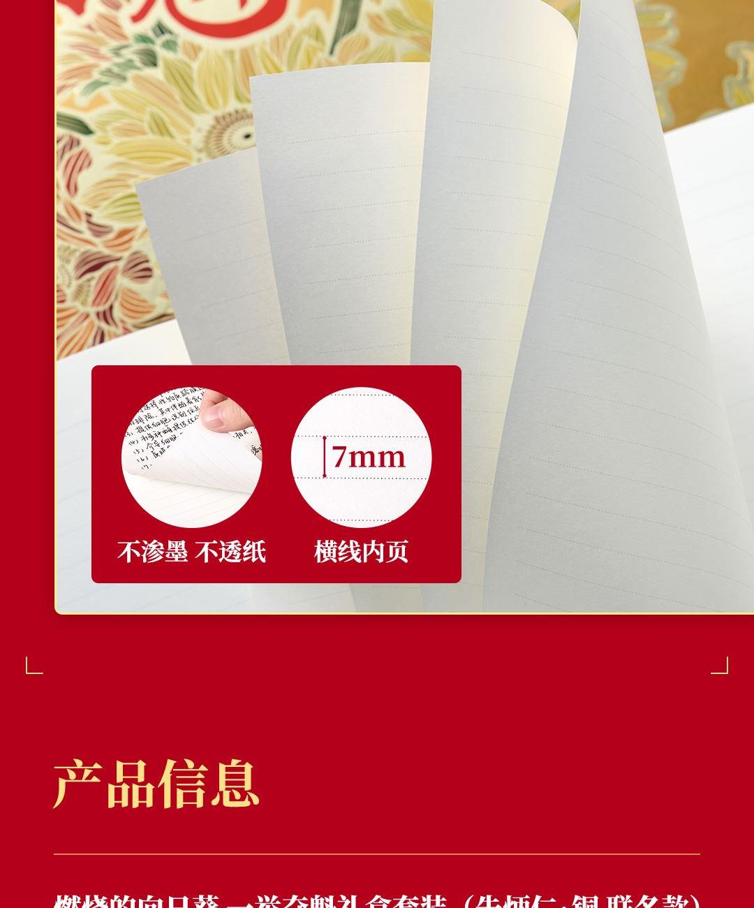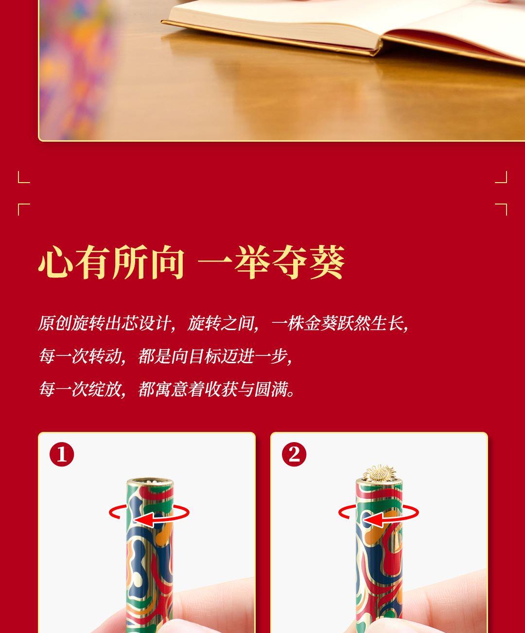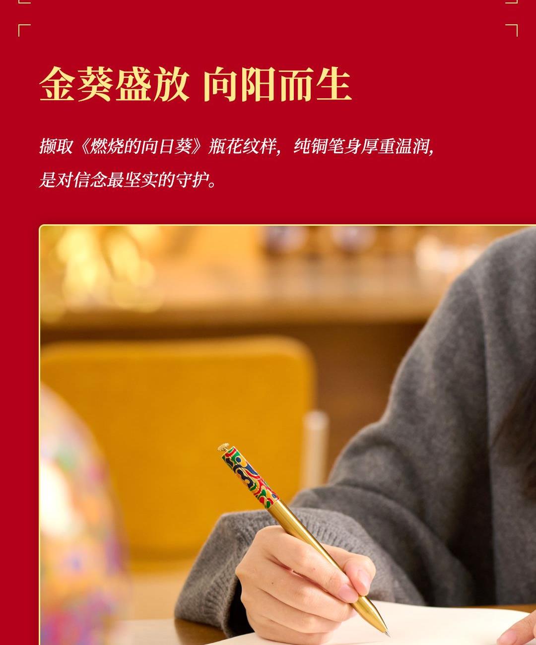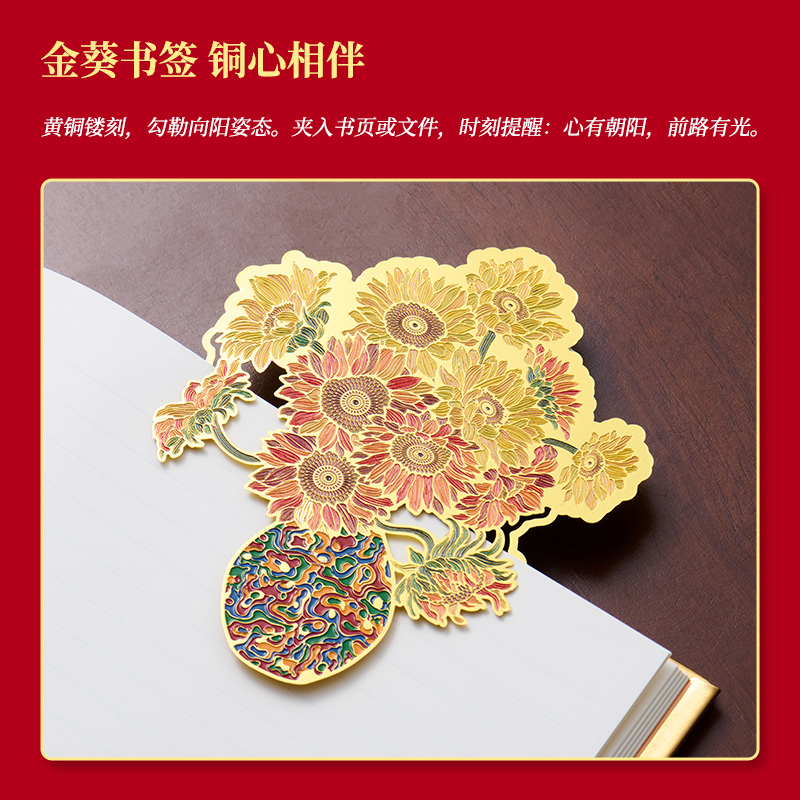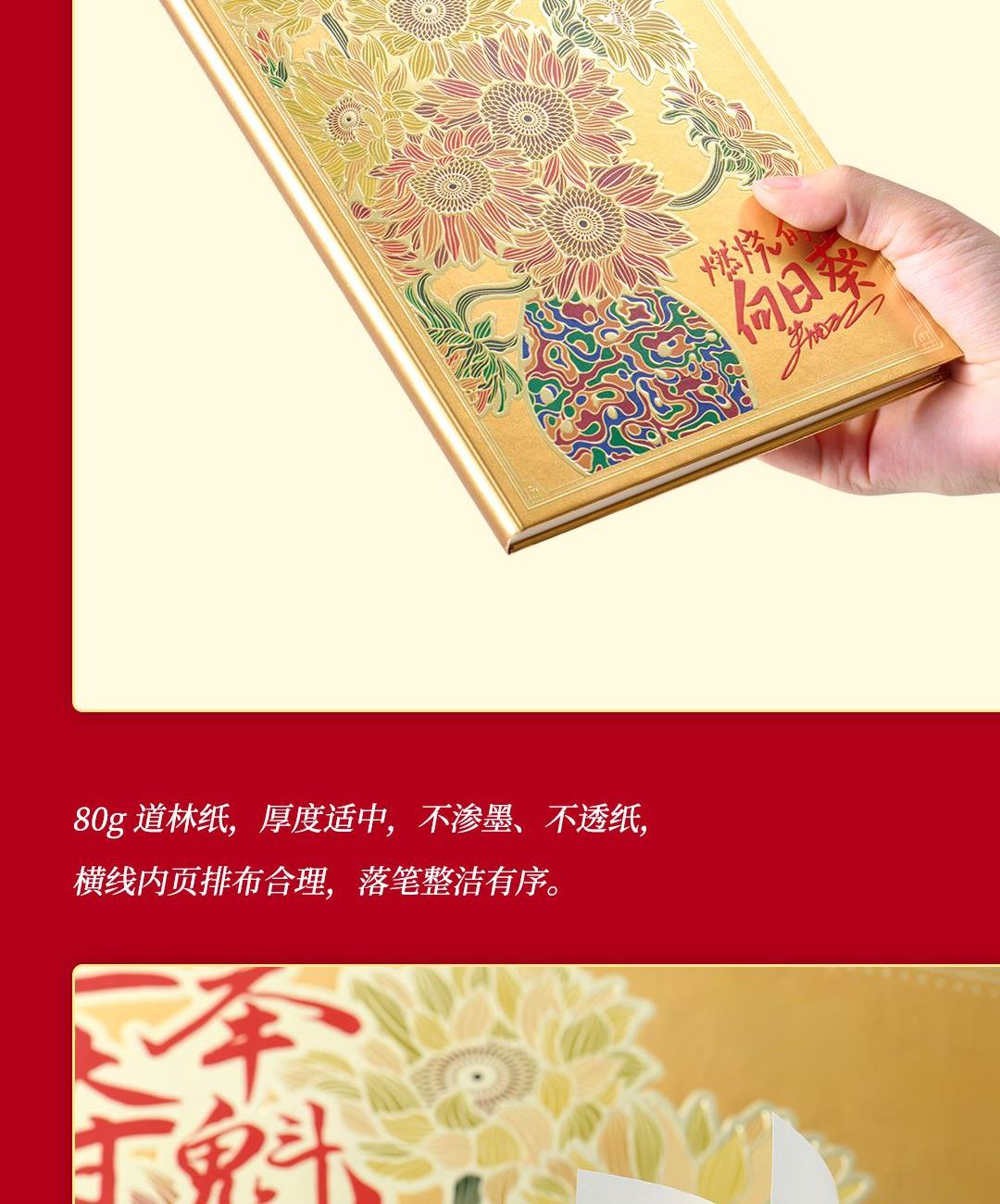4、配套筆記本*1,封面復(fù)刻熔銅肌理,燙金葵花璀璨。