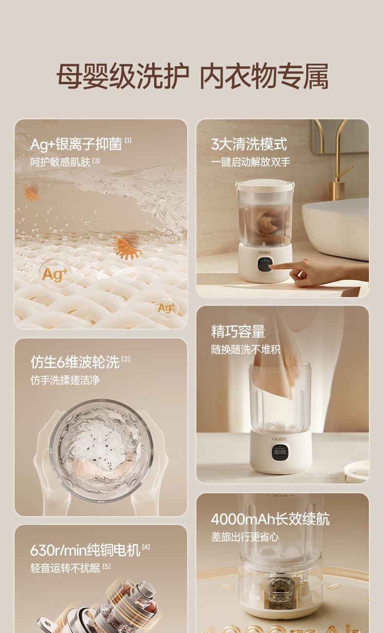 主要材質(zhì):ABS+硅膠提手 電壓:7.4V 功率:25W 洗滌容量:0.1kg 電池容量:2000mAh 三種模式清洗,滿足貼身衣物清洗需求 攜帶方便,家居旅行兩不誤 6維渦輪旋轉(zhuǎn),高效去除衣物污漬 換桶設(shè)計(jì),洗衣桶能直拆,清洗方便 整機(jī)防水設(shè)計(jì),防水汽防濺水 數(shù)碼顯示屏,運(yùn)行更清晰 升級(jí)開蓋提手,開蓋更方便