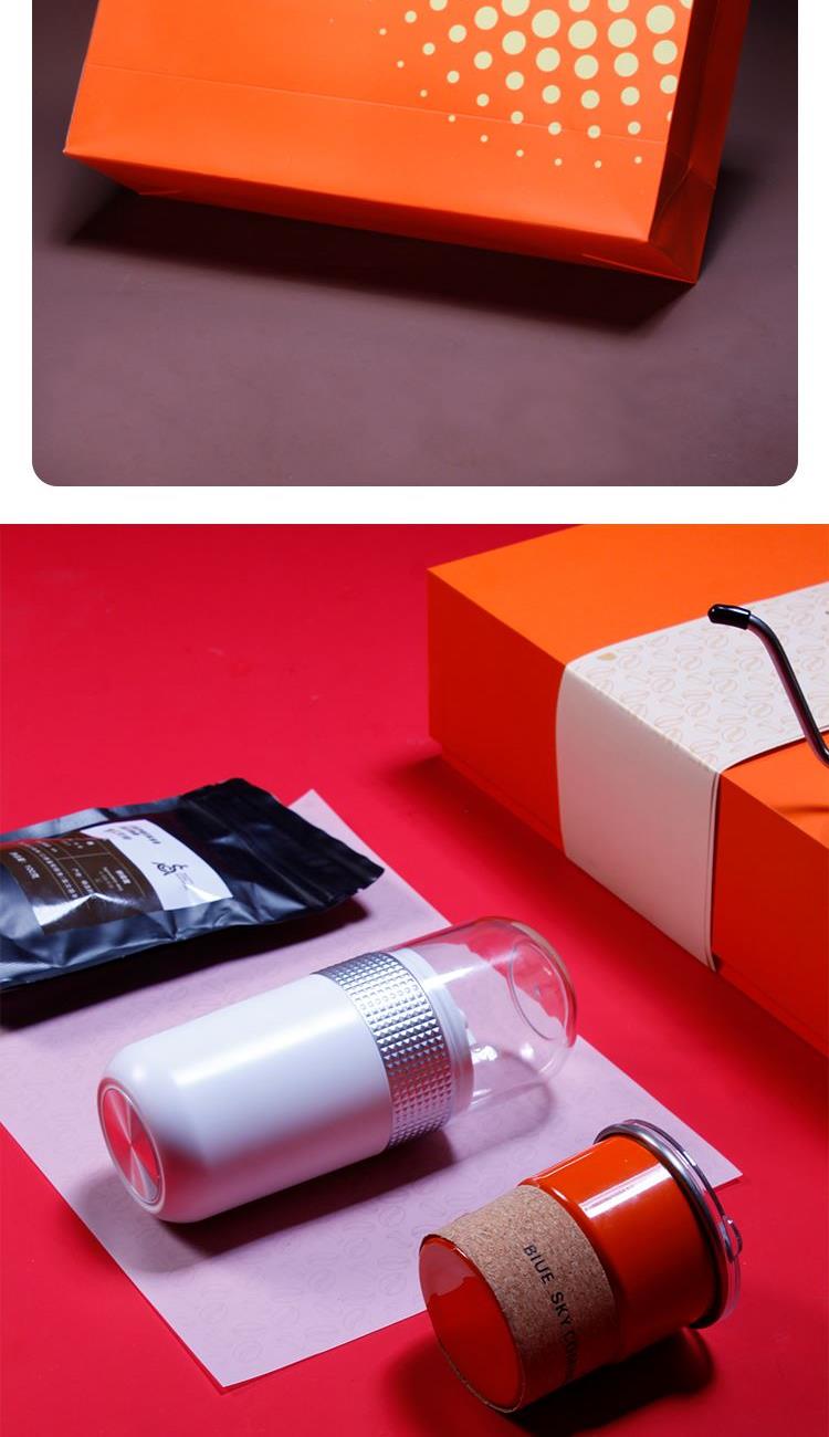 配置 戶外便攜咖啡杯x1容量280ml 戶外咖啡手沖壺*1容量250ml 意式濃縮咖啡豆*1包1000克 電動智能咖啡機(jī)*1 精裝禮盒手提袋*1 材質(zhì) 胡桃木-304-咖啡-面粉- 包裝 藝術(shù)紙 尺寸: 247*346*100mm 告別笨重器具告別局限場景告別繁瑣操作小巧機(jī)身?輕便攜帶?開箱即沖 享受現(xiàn)磨咖啡風(fēng)味