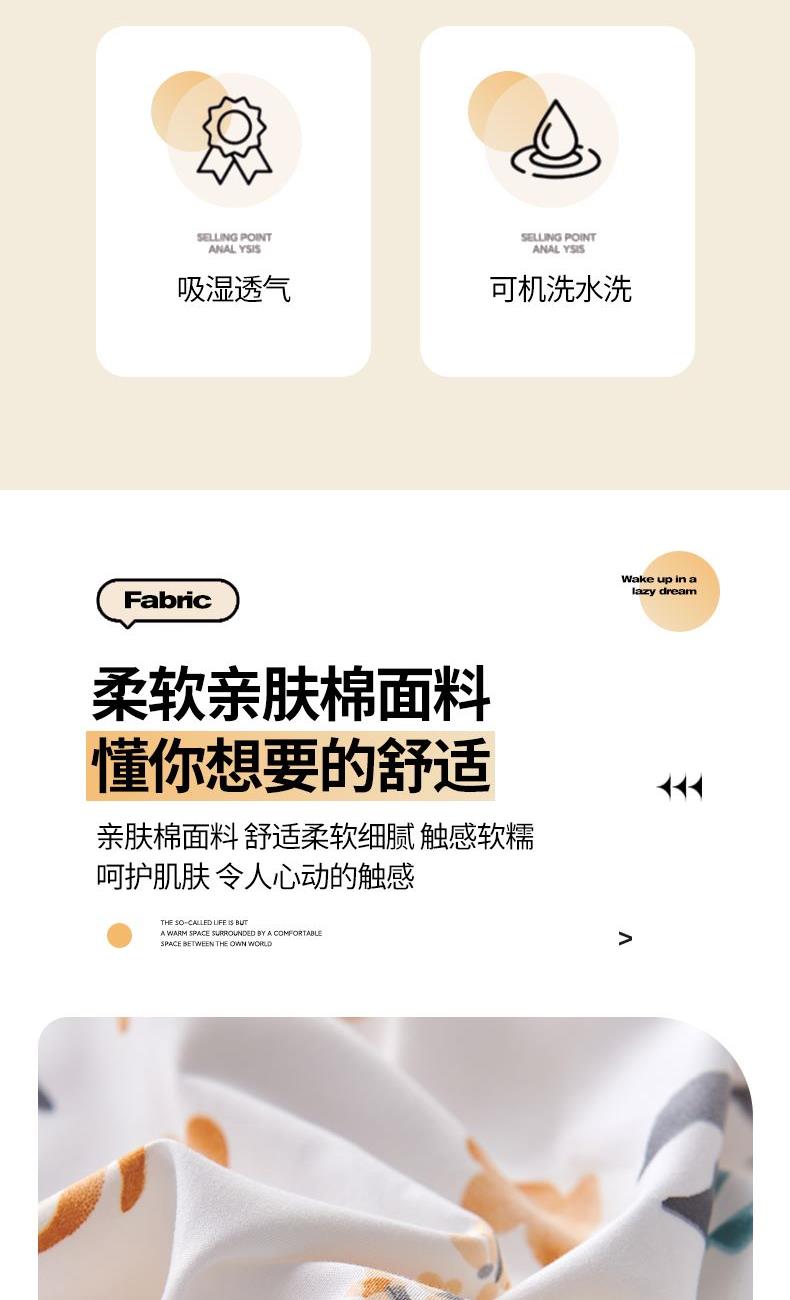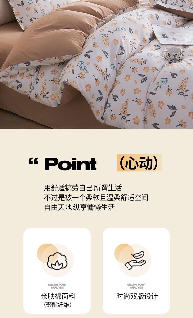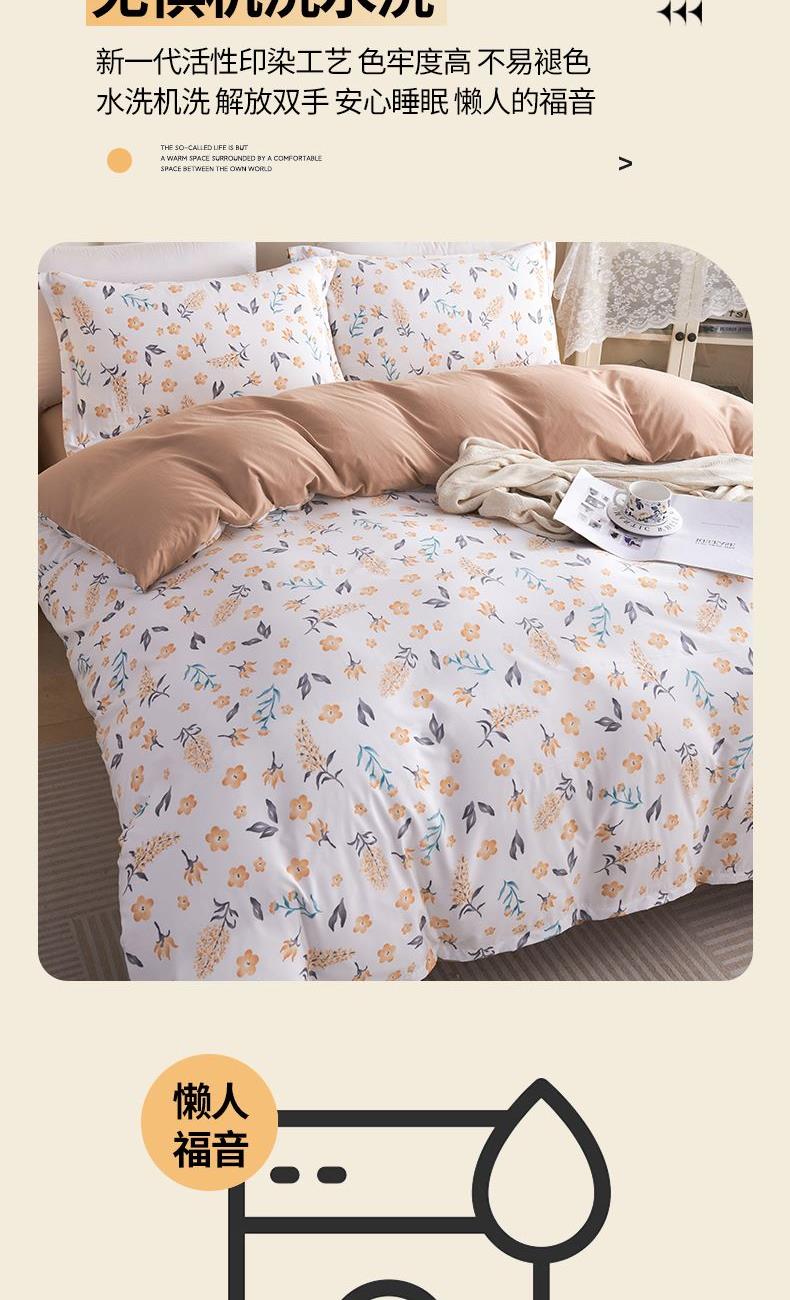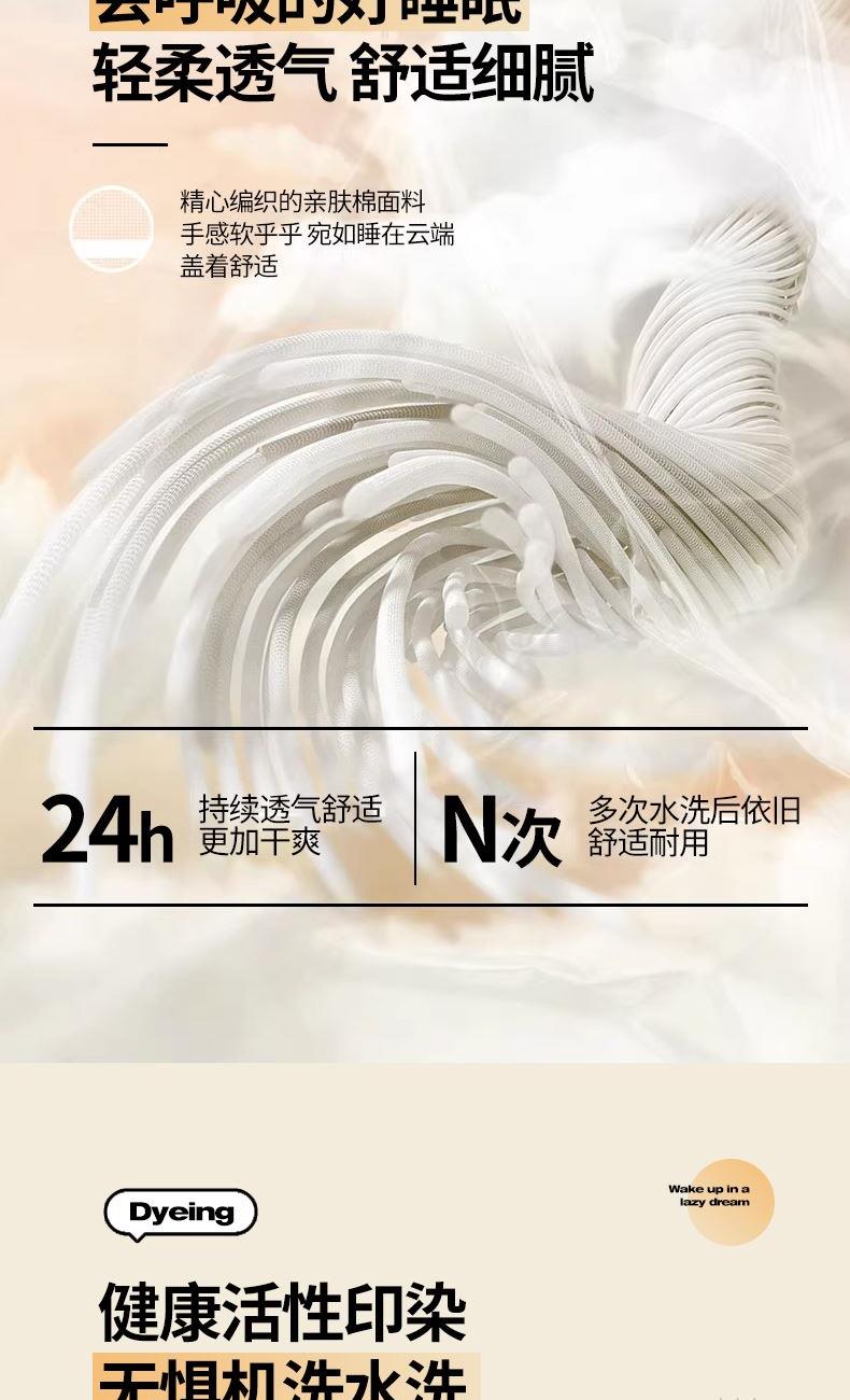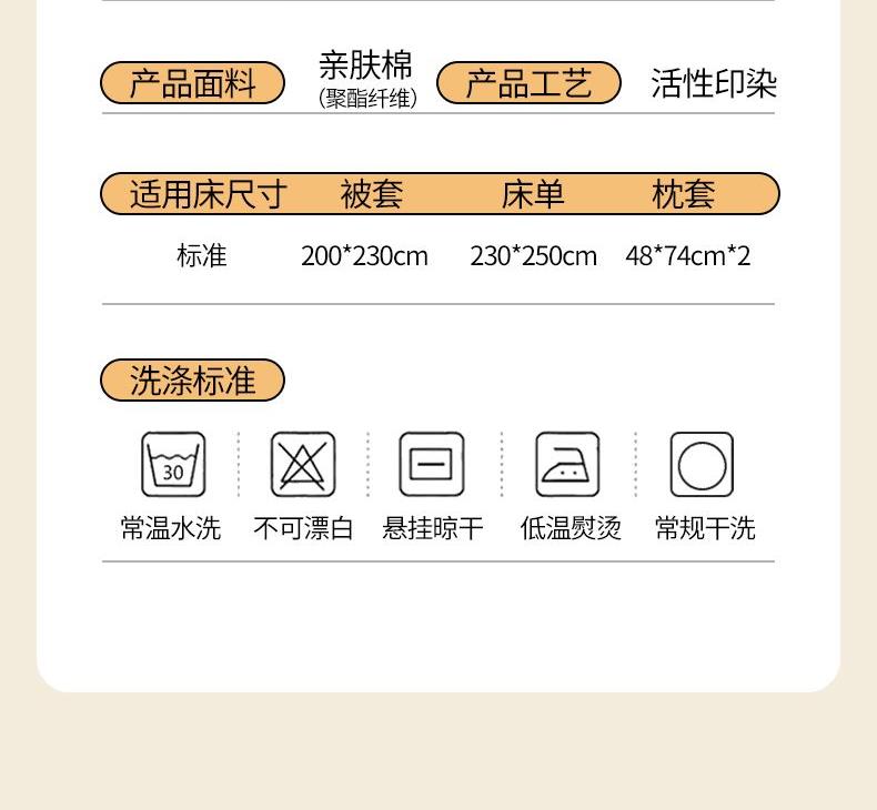 參數(shù): 面料:加厚親膚棉(聚酯纖維) 產(chǎn)品等級(jí):合格品 尺寸:被套200*230cm 床單230*250cm 枕套48*74cm*2只 賣(mài)點(diǎn): 1、柔軟親膚棉面料 舒適柔軟細(xì)膩 觸感舒適 呵護(hù)肌膚; 2、織物柔軟細(xì)膩 輕盈透氣 光澤柔和 色彩更鮮艷,久洗不褪色。