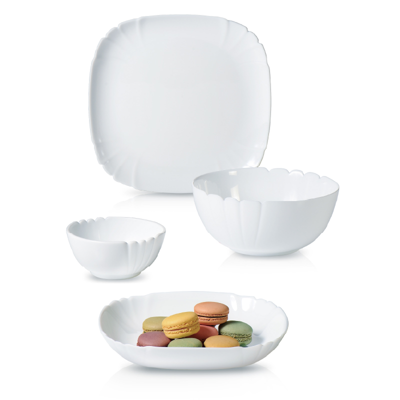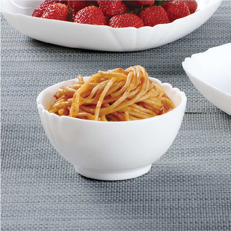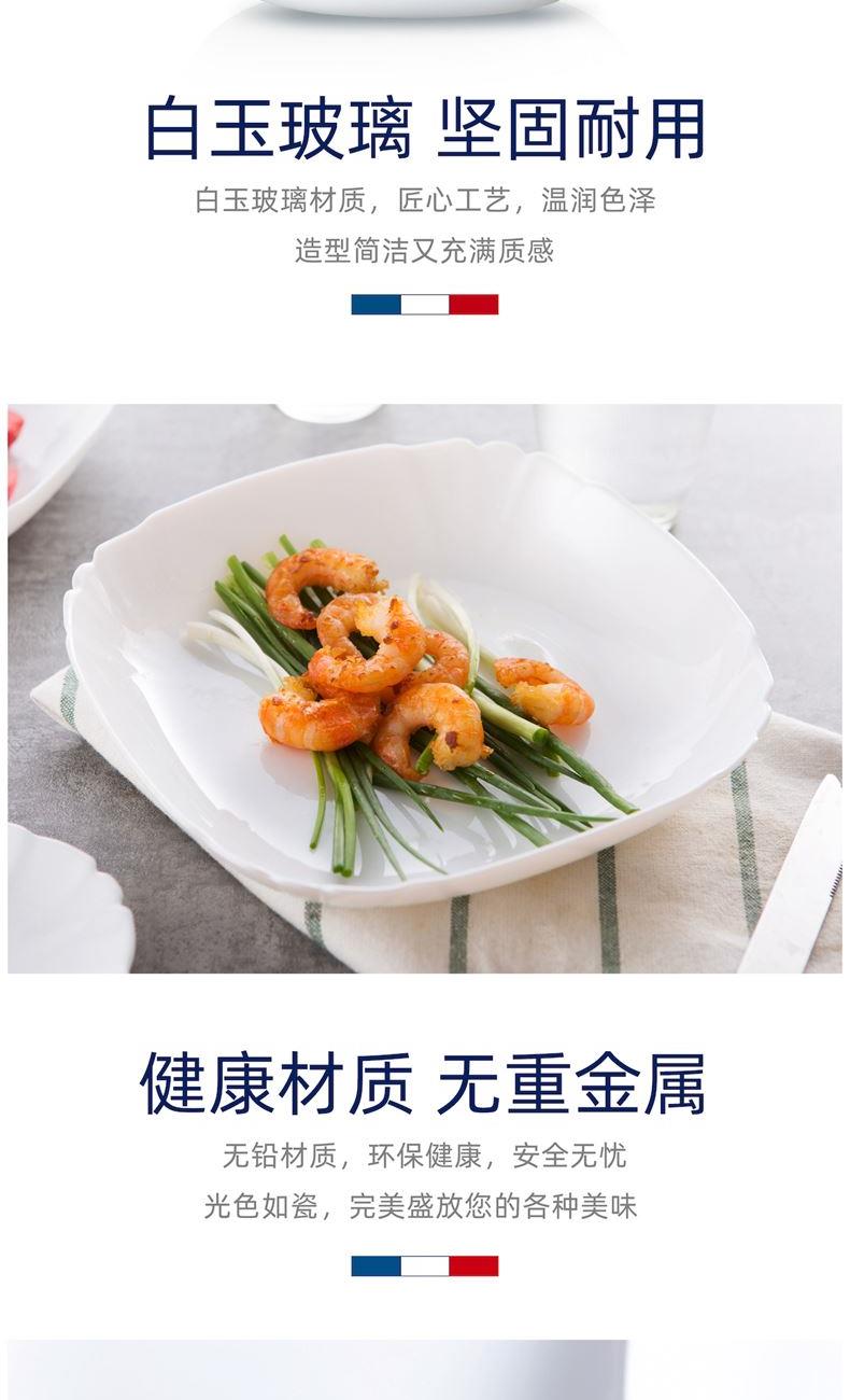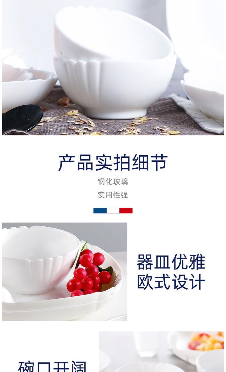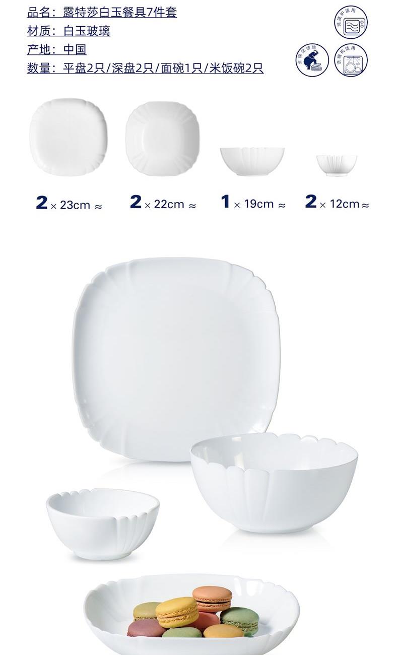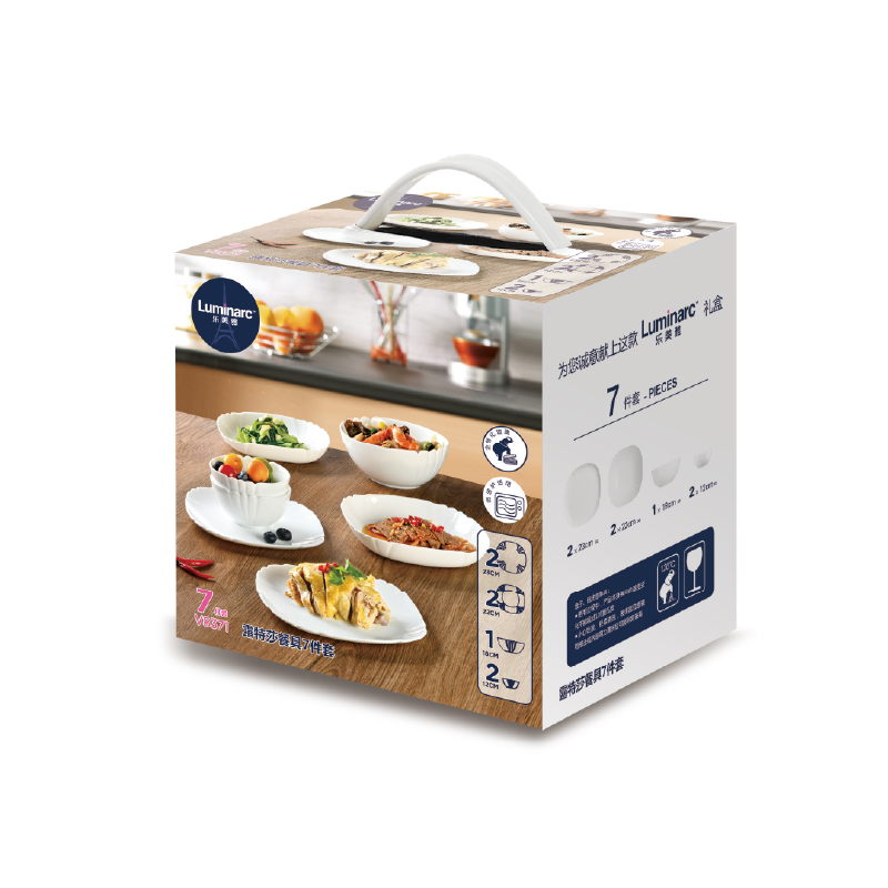 套件組成:飯碗12cm*2+深盤22cm*2+平盤23cm*2+湯碗18cm*1 材質:白玉玻璃 工藝:鋼化工藝 包裝:彩盒 外箱尺寸:454*379*259mm 毛重:2.7kg/11kg 特點: 1.無鉛玻璃材質,環(huán)保、健康 2.全鋼化工藝,抗震耐刮擦,耐溫差120°C,微波爐、洗碗機、皆適用 3.無孔表面,易沖無殘留,減少細菌產生 4.法式設計, 質薄輕巧,方便收納,節(jié)省空間