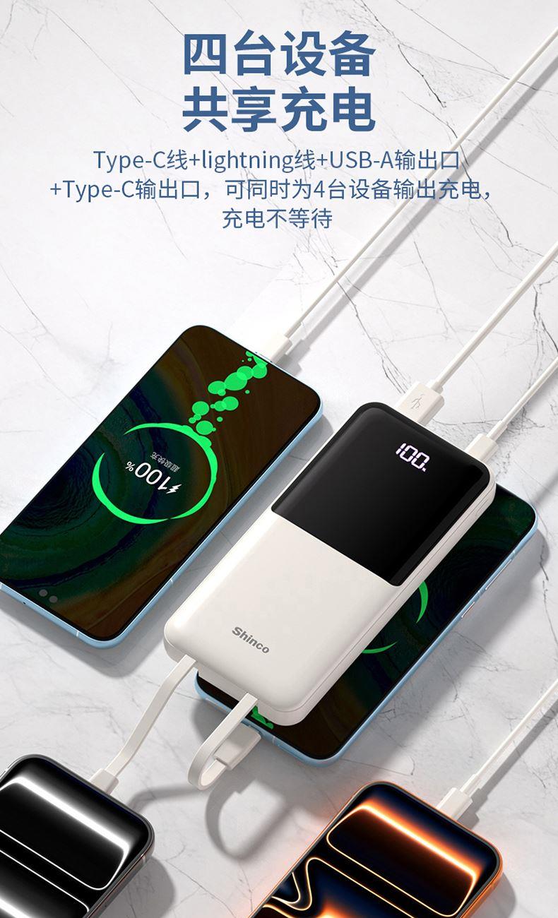 Type-C線+lightning線+USB-A輸出口+Type-C輸出口,可同時為4臺設(shè)備輸出充電,充電不等待