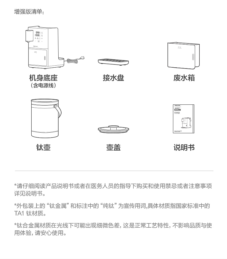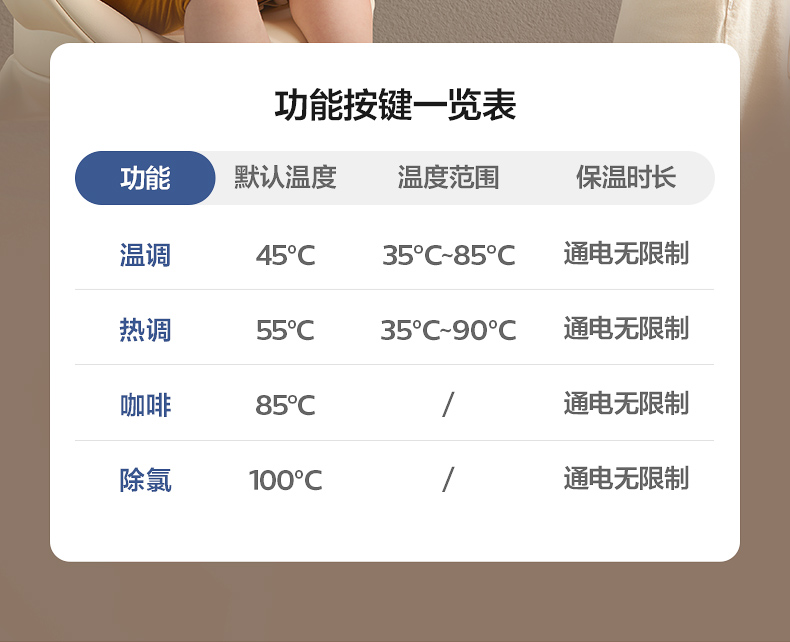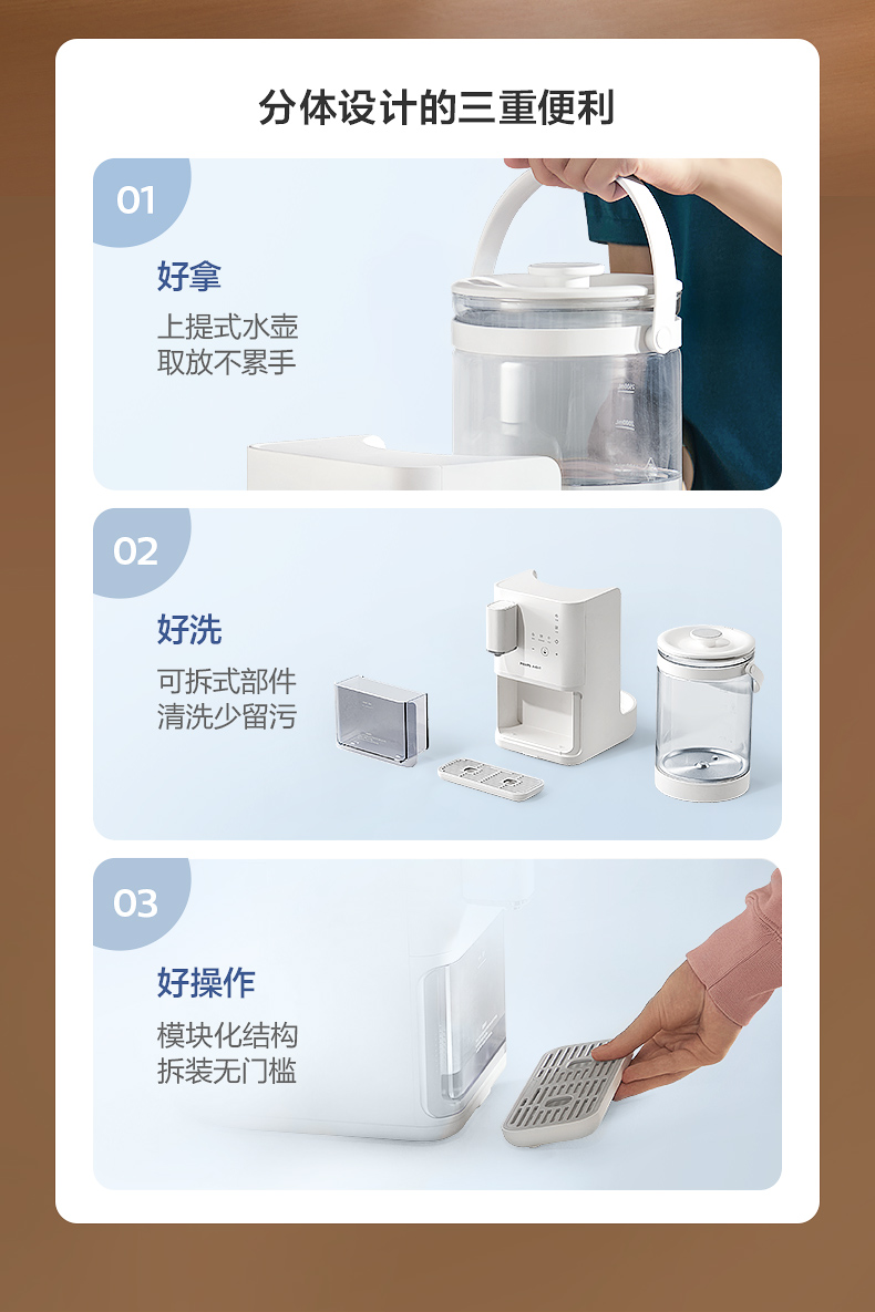 主要材質(zhì):ABS 電壓:220V~50Hz 功率:1200W 容量:3L 預(yù)排技術(shù),確保每次出水潔凈如初 升降式出水口,避免接水飛濺更干凈 3L玻璃水壺設(shè)計(jì),滿足全家沖飲需求定 溫定量出水,滿足不同沖泡溫度 鈦金屬發(fā)熱盤(pán),穩(wěn)定加熱不易腐蝕 風(fēng)冷快速降溫,沖奶不再久等 接水盤(pán)/回收箱可拆洗,衛(wèi)生看得見(jiàn)