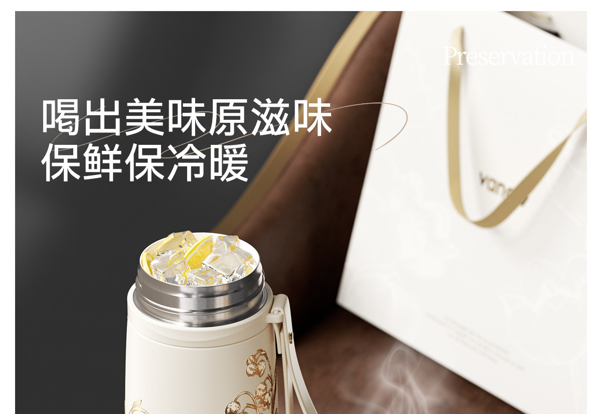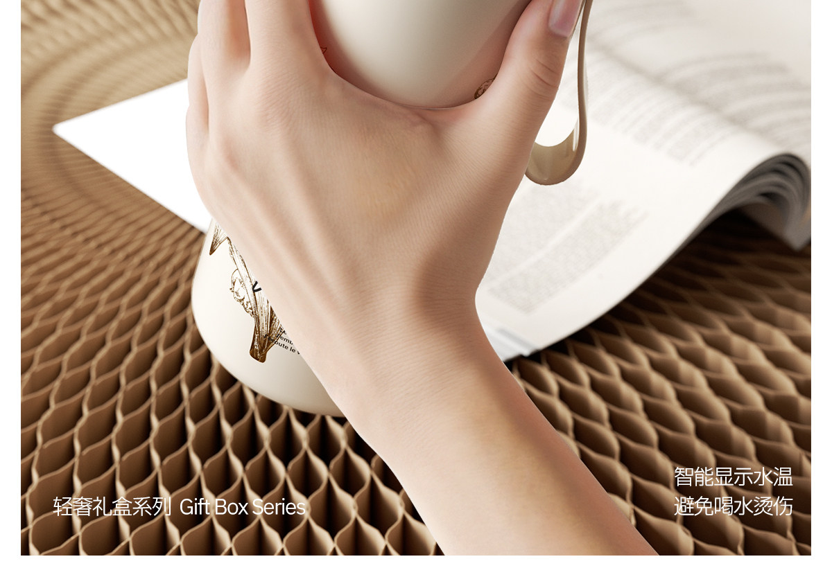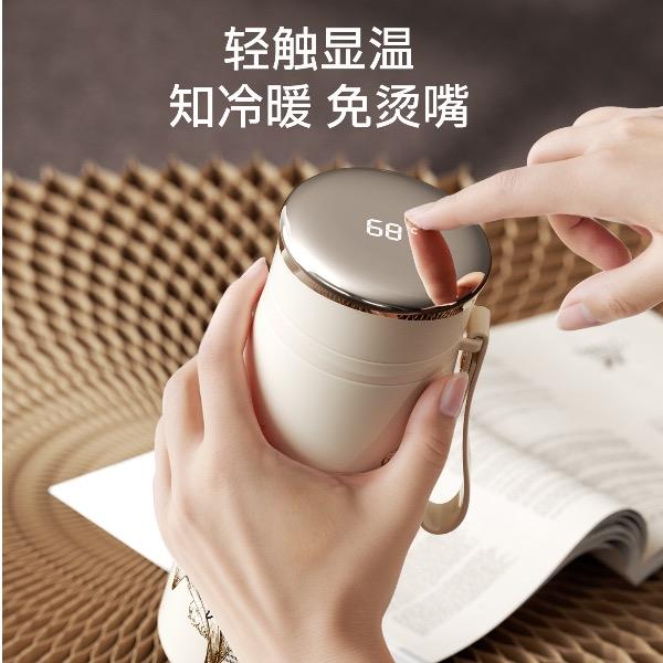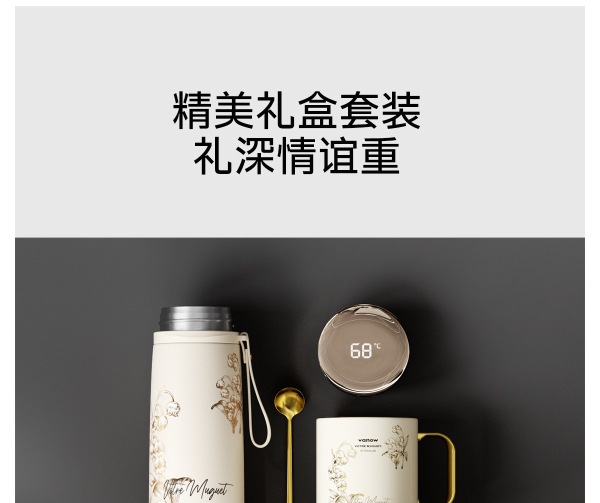 型號:VO-LL46CT 顏色:鈴蘭白 容量:460ml+350ml 尺寸:190*72mm/103*86mm 材質(zhì):316不銹鋼內(nèi)膽,陶瓷馬克杯,硅橡膠 產(chǎn)品賣點:1.知溫度識冷暖,心坎里的保溫杯 2.輕觸顯溫,黑科技智能加持 3.獨立茶倉,優(yōu)雅喝茶不吐渣 4.鎏金馬克杯,美觀且握感舒適