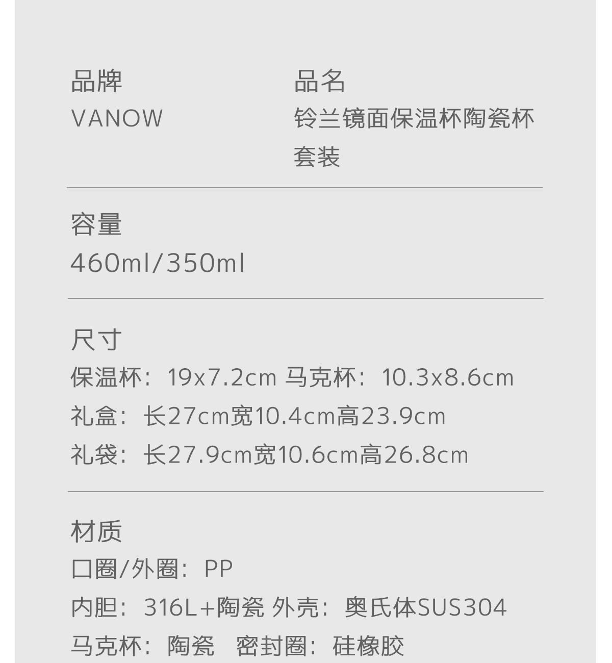 Vanow鈴蘭鏡面保溫杯陶瓷杯套裝VO-LL46CT Vanow鈴蘭鏡面保溫杯陶瓷杯套裝VO-LL46CT