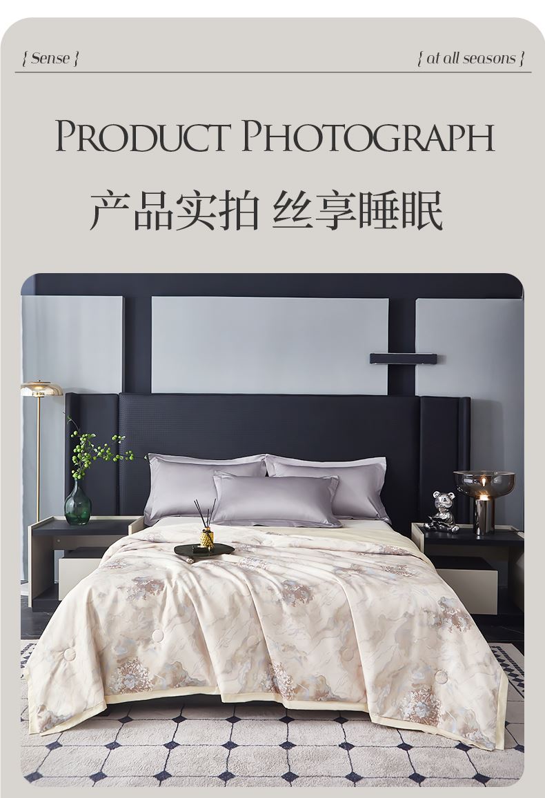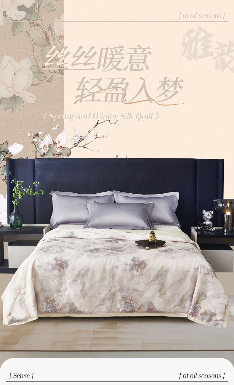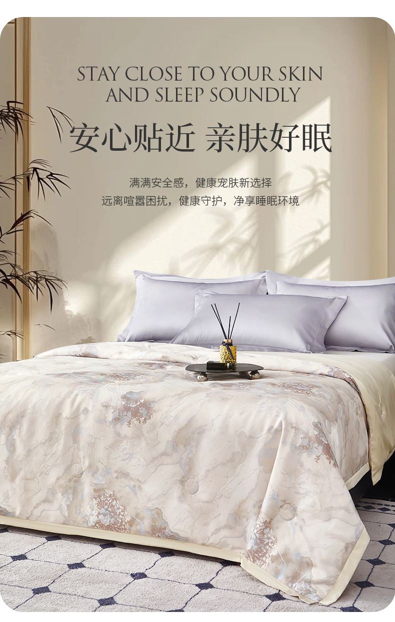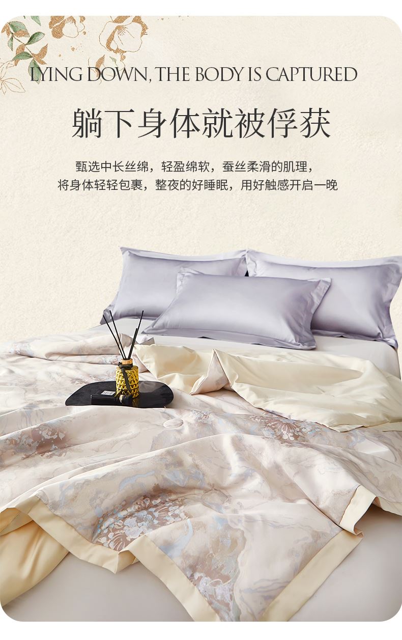 貨號(hào):JB-1379 規(guī)格:180*210cm 面料:數(shù)碼印織云緞 填充:100純蠶絲(中長絲) 總重:1350G 1.國風(fēng)美學(xué),奢享睡眠數(shù)碼印織云緞,印染東方詩意,100純中長絲蠶絲填充,蓬松恒溫。四周寬邊設(shè)計(jì),搭配精美絎縫,典雅不移位。 2.蠶絲富含氨基酸,天然沁潤,是天然蛋白纖維,具有良好的親膚性給肌膚帶來SPA感潤養(yǎng)體驗(yàn)。