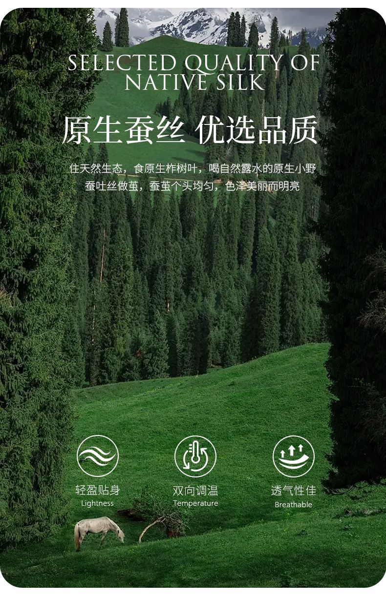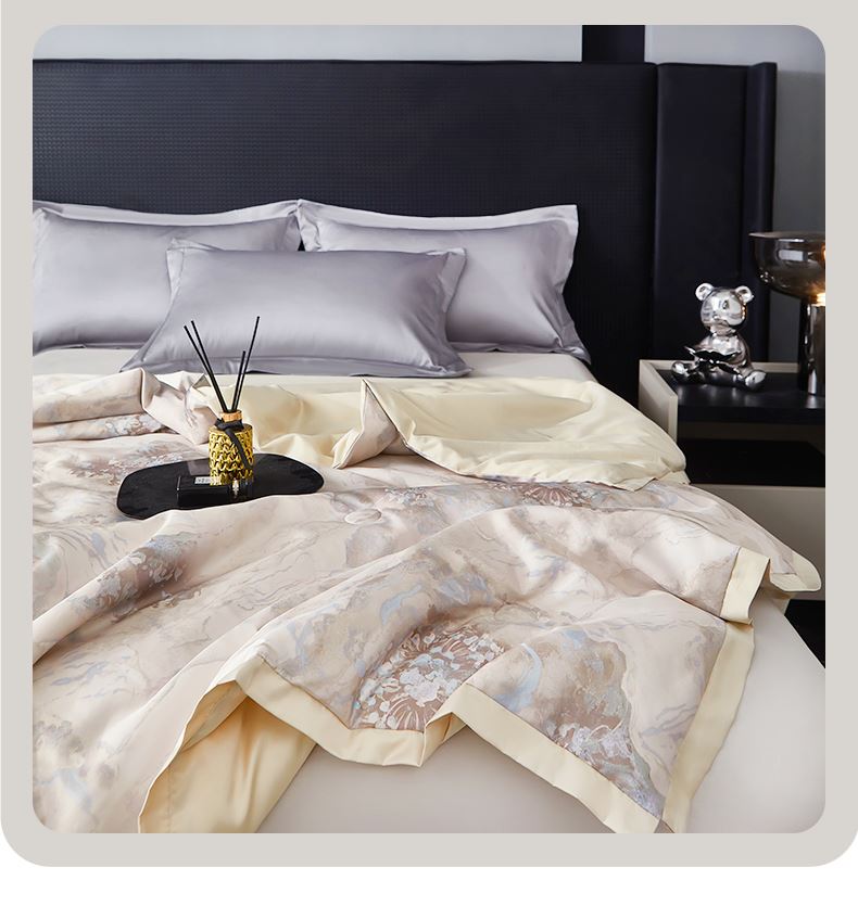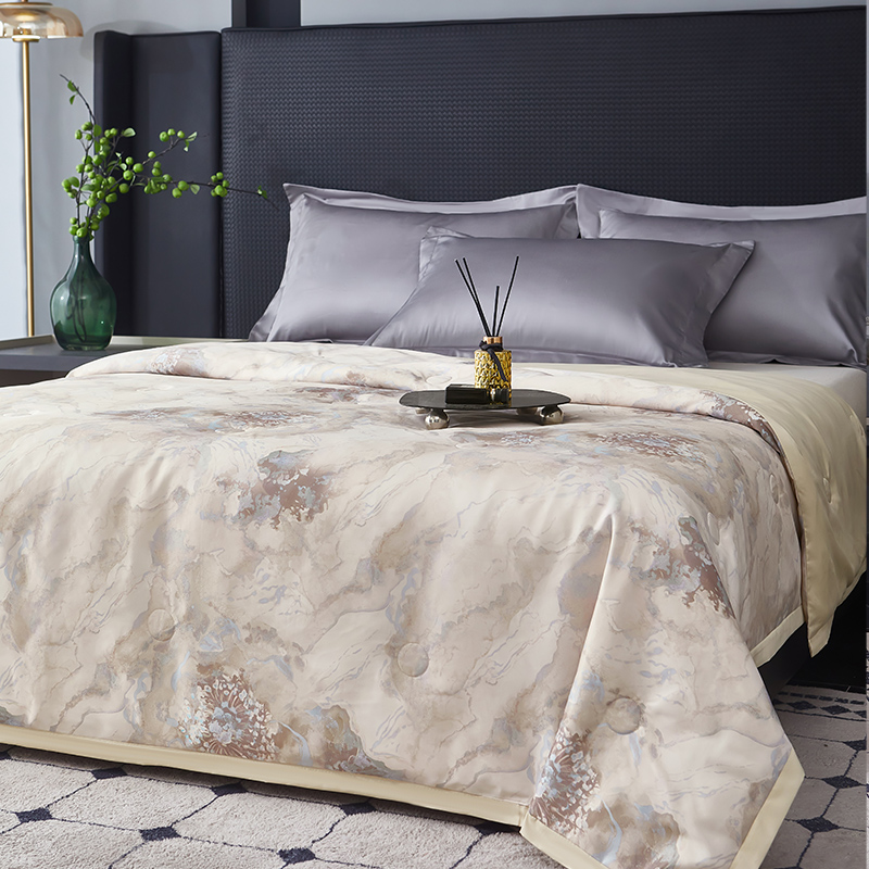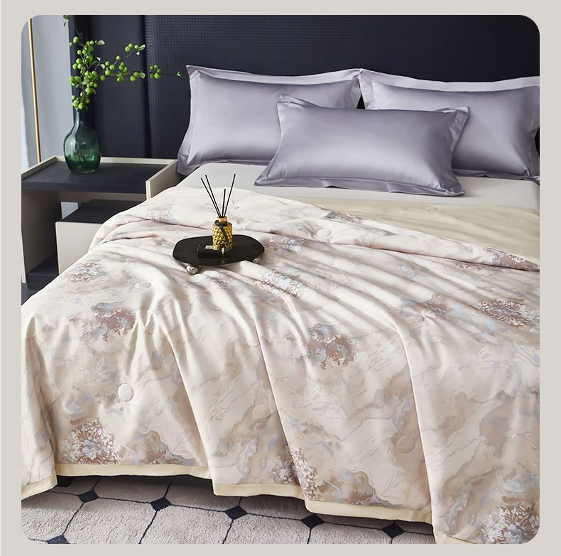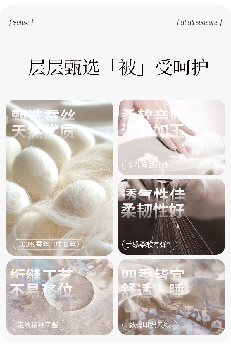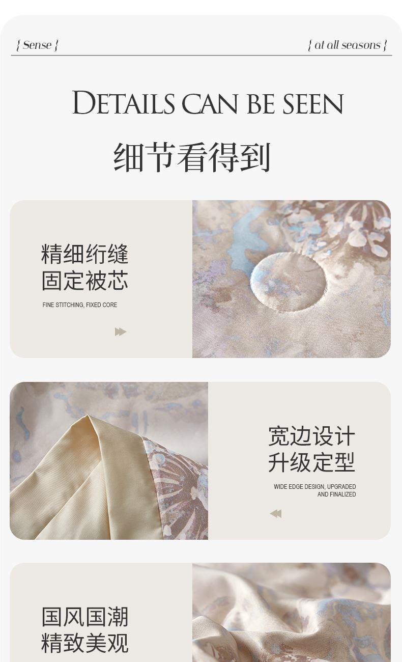 貨號(hào):JB-1379 規(guī)格:180*210cm 面料:數(shù)碼印織云緞 填充:100純蠶絲(中長絲) 總重:1350G 1.國風(fēng)美學(xué),奢享睡眠數(shù)碼印織云緞,印染東方詩意,100純中長絲蠶絲填充,蓬松恒溫。四周寬邊設(shè)計(jì),搭配精美絎縫,典雅不移位。 2.蠶絲富含氨基酸,天然沁潤,是天然蛋白纖維,具有良好的親膚性給肌膚帶來SPA感潤養(yǎng)體驗(yàn)。