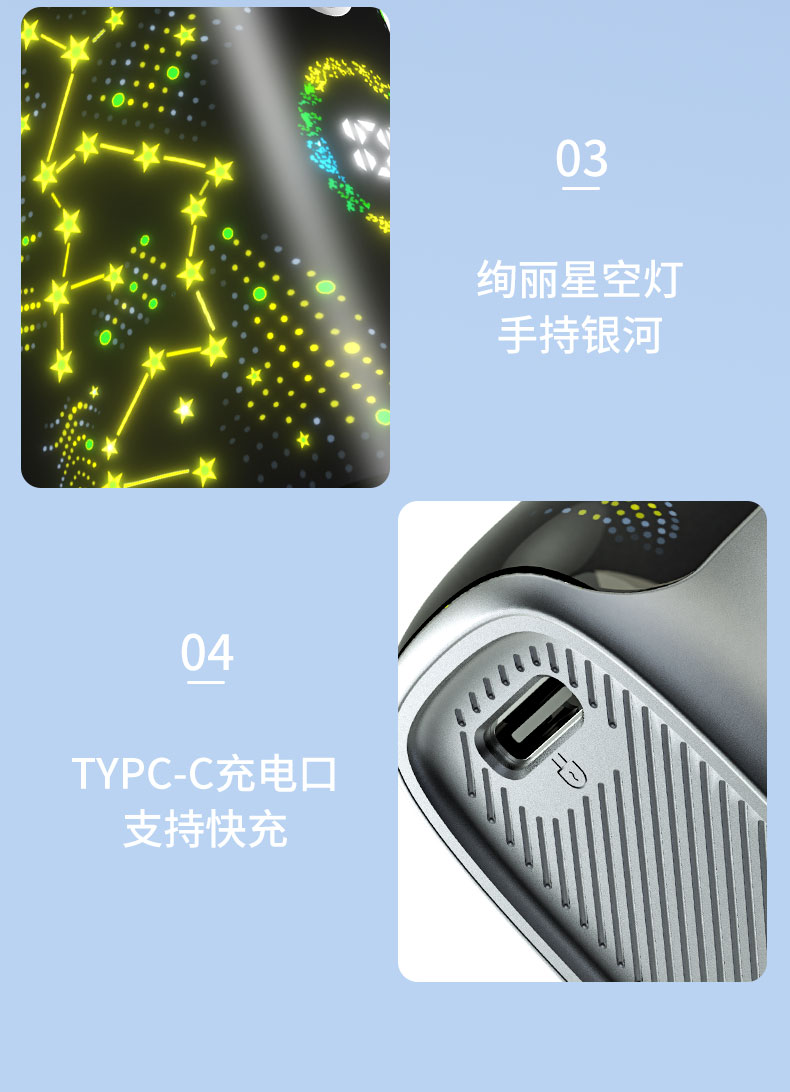 星空燈效:一機(jī)兩用,既是風(fēng)扇也是星空投影燈。柔和星光漫射全屋,輕松營造夏夜浪漫氛圍,獨(dú)處、聚會(huì)都氛圍感拉滿。