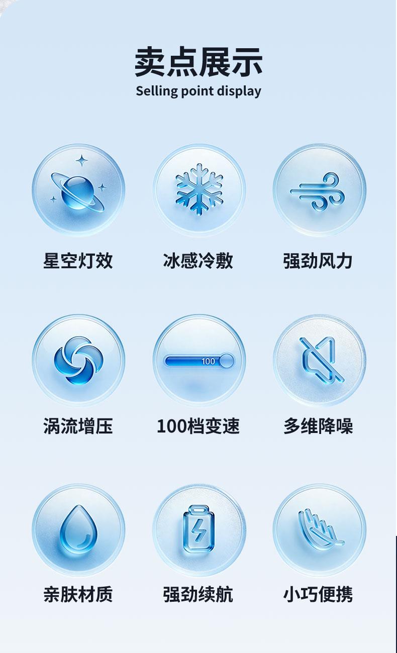 冰感冷敷雙降溫:冷風(fēng) + 冷敷雙重降溫,可貼膚冷敷額頭、頸部,快速消暑,戶外、運(yùn)動(dòng)后超實(shí)用。