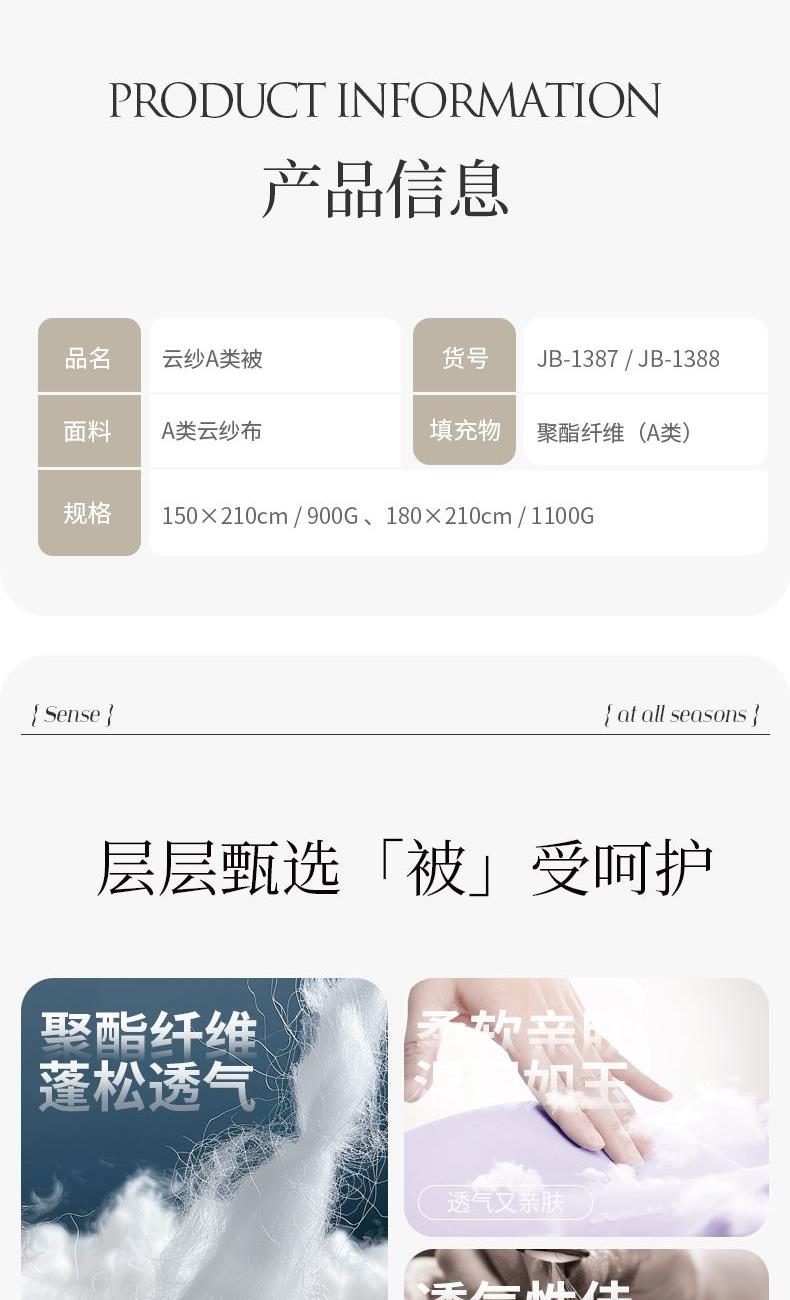 貨 號:JB-1386 規(guī) 格:180*210cm 面 料:A類針織布 填 充:聚酯纖維(A類) 總 重:1500G 1.肌膚安心之選!云紗A類被,面料與填充均達A類安全標準,觸感如云輕柔,帶來無菌無味的安心睡眠環(huán)境。 2.云感輕柔,安心加倍!雙A類品質保障,云紗布面料爽滑,填充物潔凈蓬松,給寶寶和孕媽肌膚般的溫柔守護。 3.為嬌嫩肌膚量身打造!云紗A類被,嚴格遵循母嬰安全標準,面料填充雙A類,輕盈蓬松,呵護睡眠每一刻。