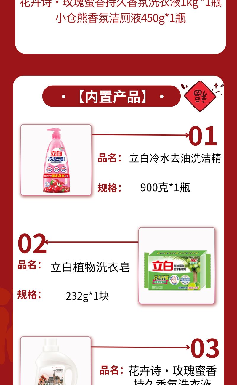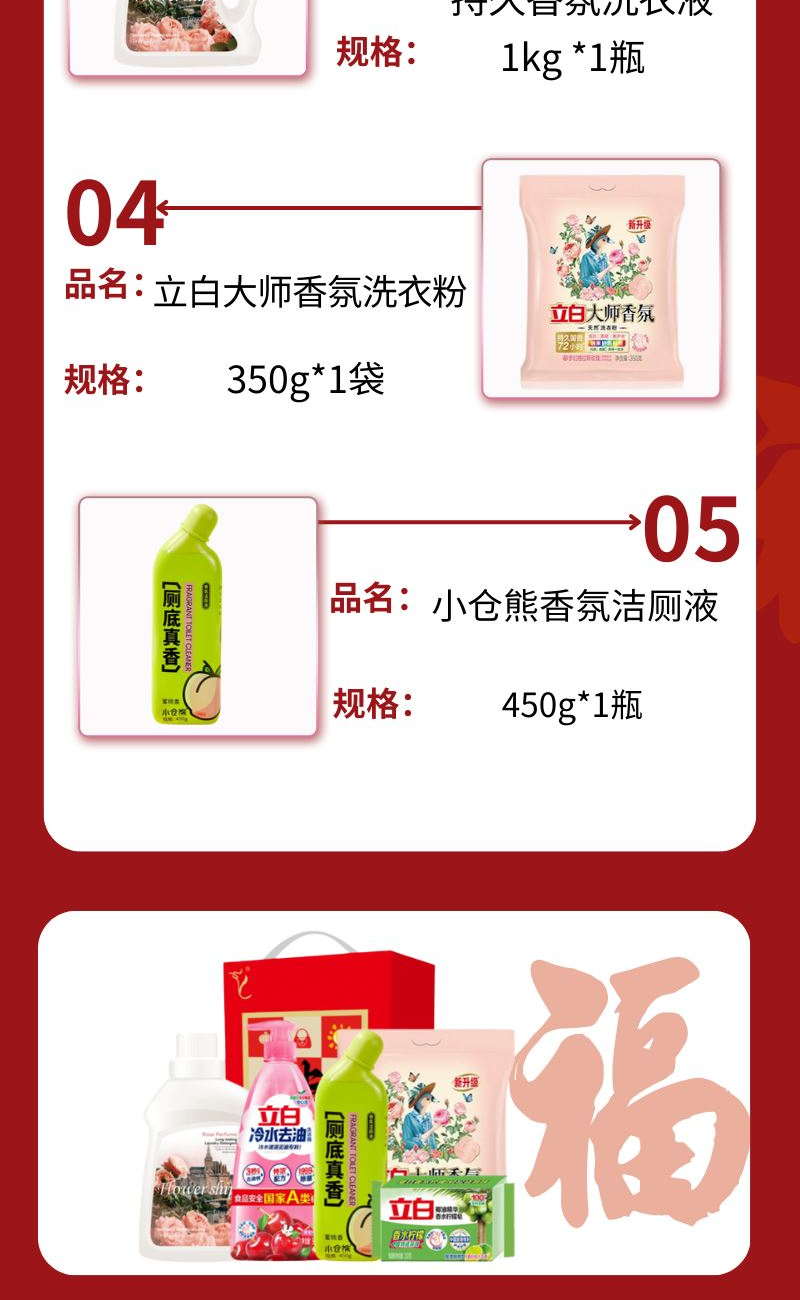 配置: 立白冷水去油洗潔精900克*1瓶 立白植物洗衣皂232g*1塊 立白大師香氛洗衣粉350g*1袋 花卉詩·玫瑰蜜香持久香氛洗衣液1kg *1瓶 小倉熊香氛潔廁液450g*1瓶 賣點: 可選產(chǎn)品豐富多樣,禮箱隨心組合,多種價位因需而定,充分滿足各種送禮需求,是商務(wù)送禮、單位福利的用心之選。