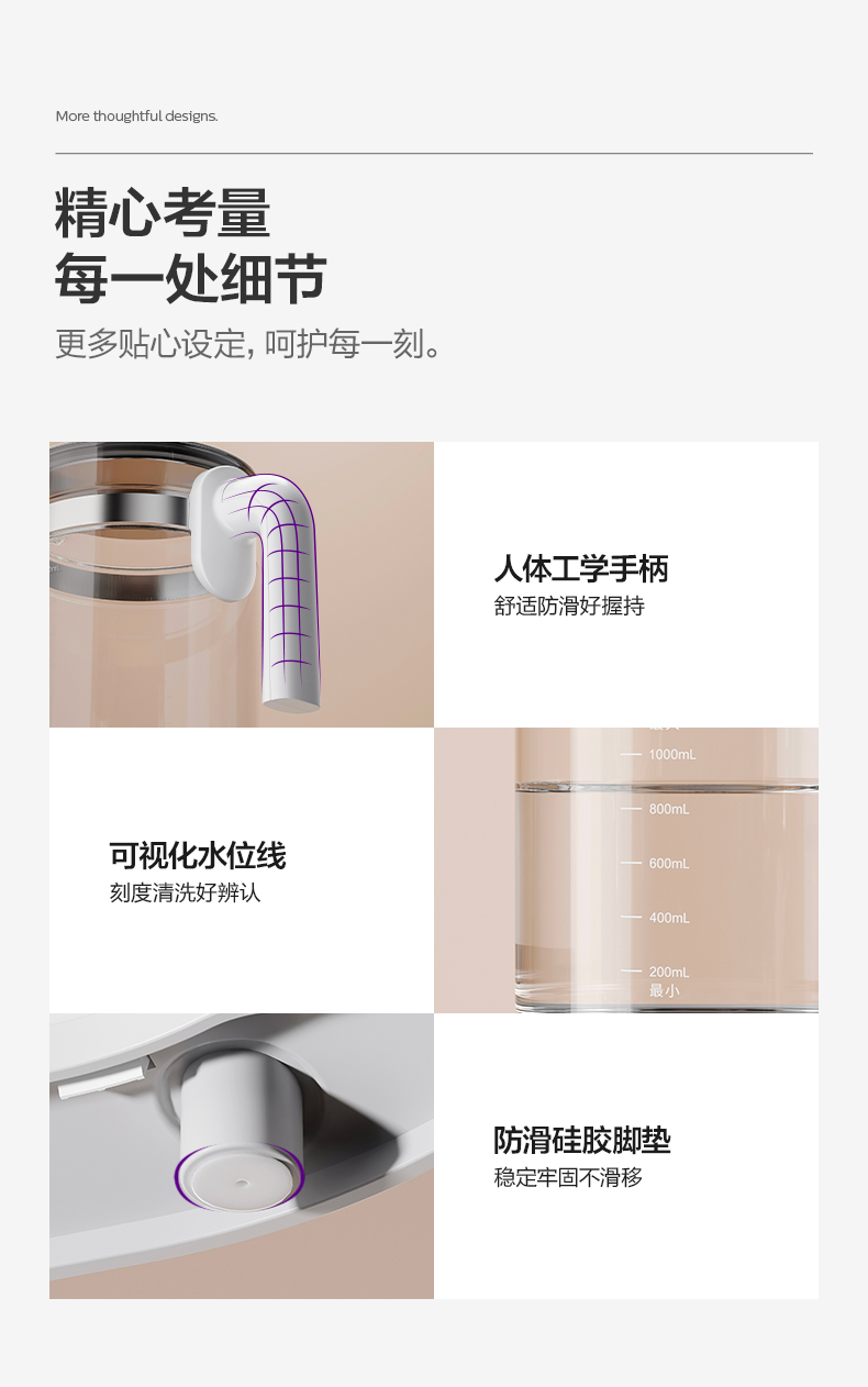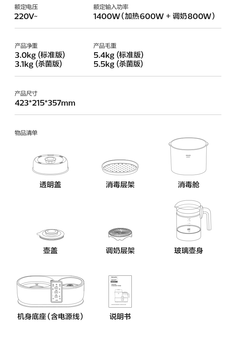 主要材質(zhì):PP+316L不銹鋼 顏色:北極白 額定電壓:220V~/50Hz 額定功率:1400W(加熱600W調(diào)奶800W) 調(diào)奶消毒烘干,一機三用 調(diào)奶/消毒雙獨立,多能分區(qū)同啟 無汞燈珠,凈菌好水泡好奶,真100℃熱流消殺 316L不銹鋼發(fā)熱盤,嚴選食品級PP材質(zhì) 人工力學(xué)視角大屏,輕觸啟亮不彎腰