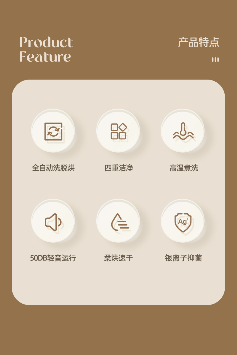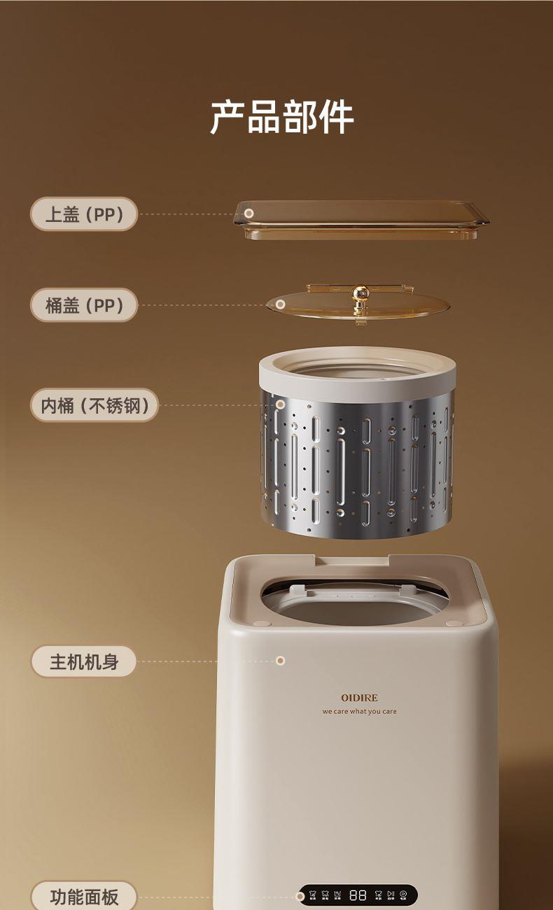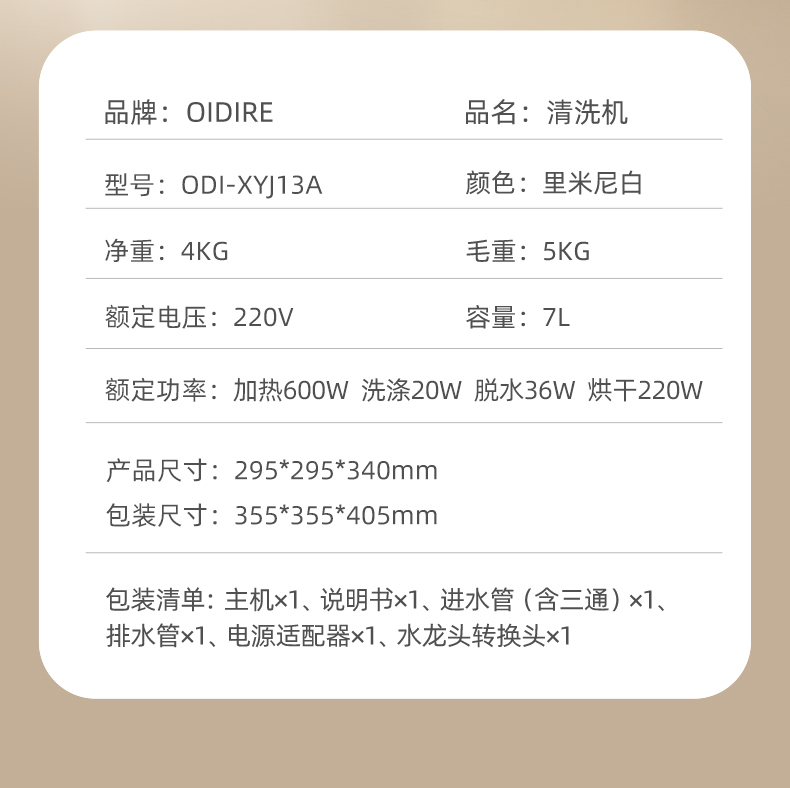 主要材質(zhì):ABS+PP+304內(nèi)桶 電壓:220V 功率:加熱600W+洗滌20W+脫水36W+烘干220W 洗滌容量:7L 觸屏控制,四大洗護模式 正反波輪仿手洗,比手洗更干凈 活水循環(huán)清洗,衣物洗凈不留污 全自動進排水,一鍵自潔桶功能 銀離子保護,防止細菌滋生 開蓋自動停機,中途可添加衣物 洗滌單脫功能選擇,不銹鋼內(nèi)桶 高溫煮洗,深入去污,洗脫烘一體,一站式衣物洗護