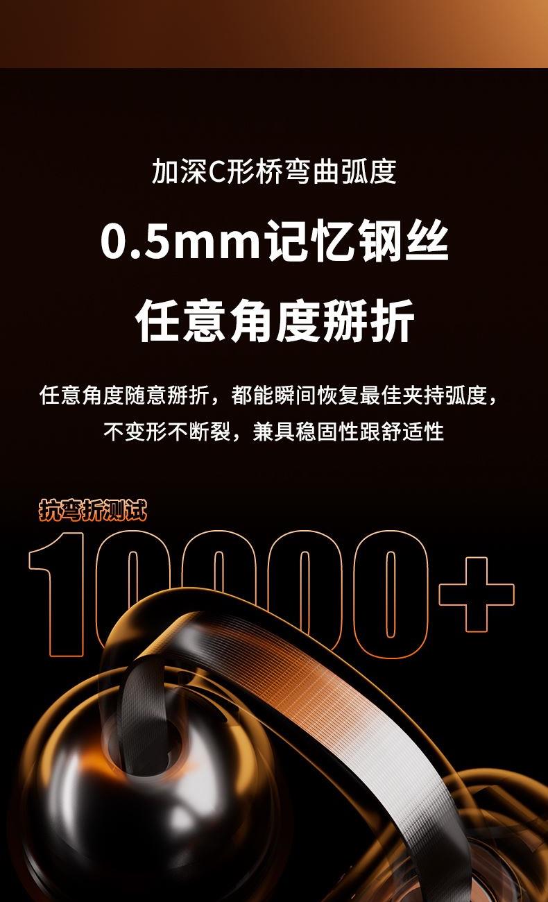 ? C形橋人體工程學(xué)調(diào)優(yōu),千種耳型,萬般適配;C形橋內(nèi)嵌0.5mm鎳鈦合金絲,任意角度掰折,都能瞬間恢復(fù)夾持弧度,時刻穩(wěn)固抓耳,大運動狂甩不掉。