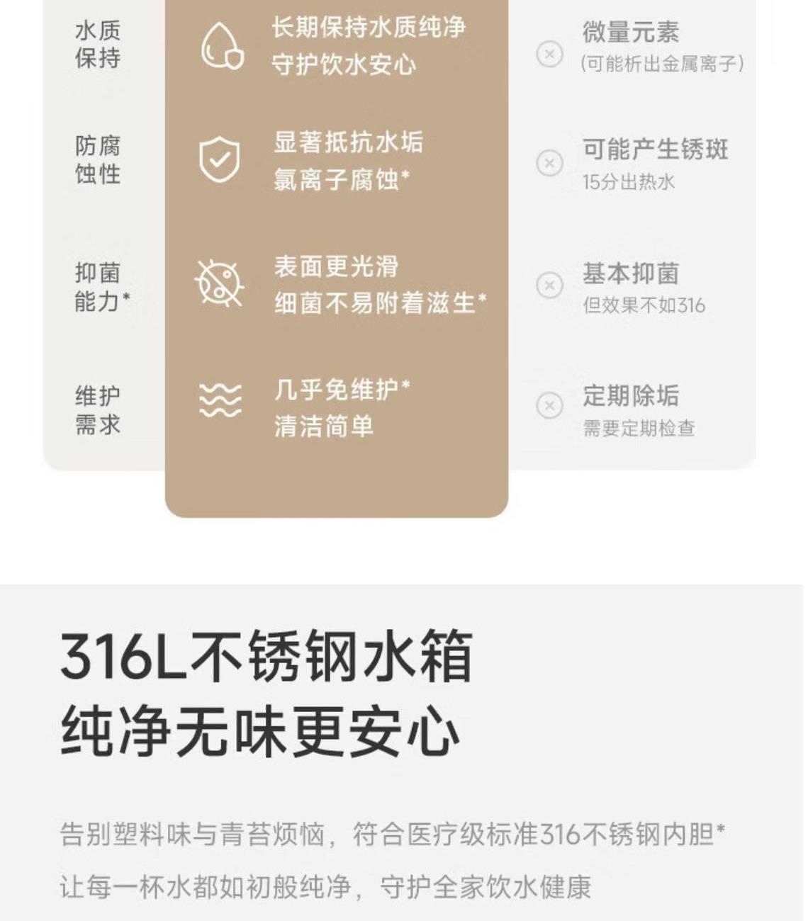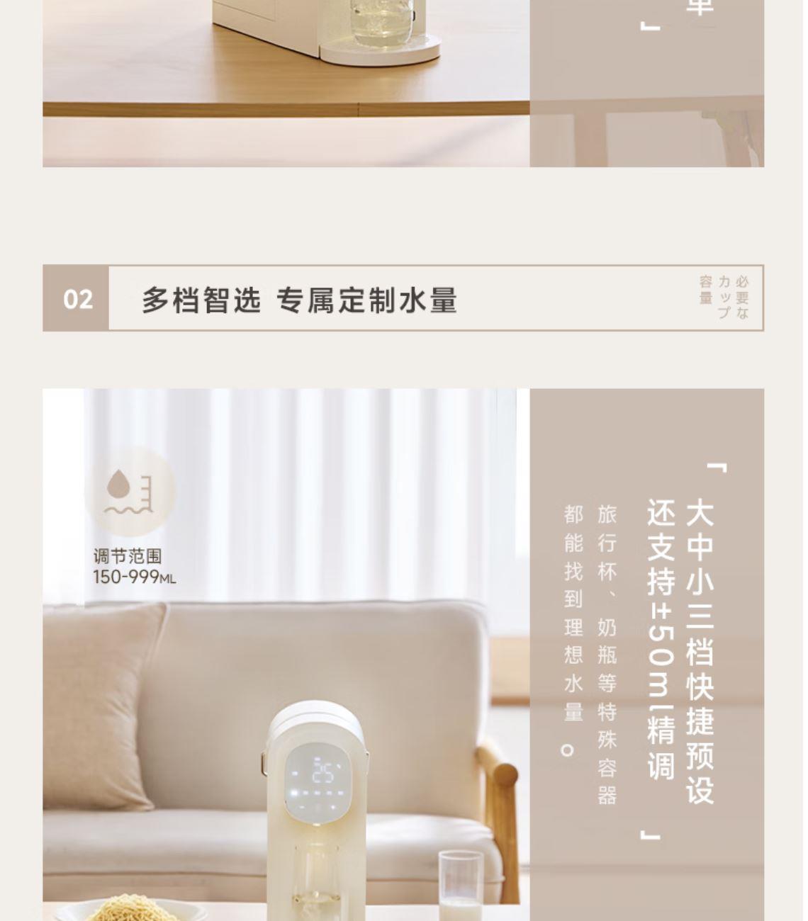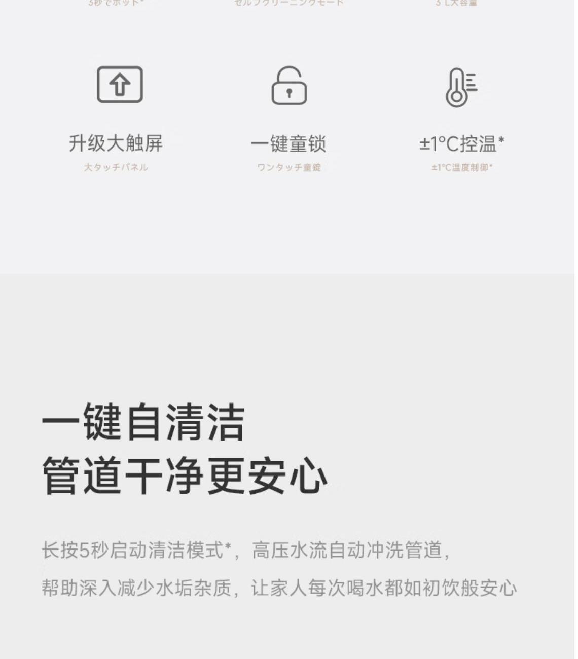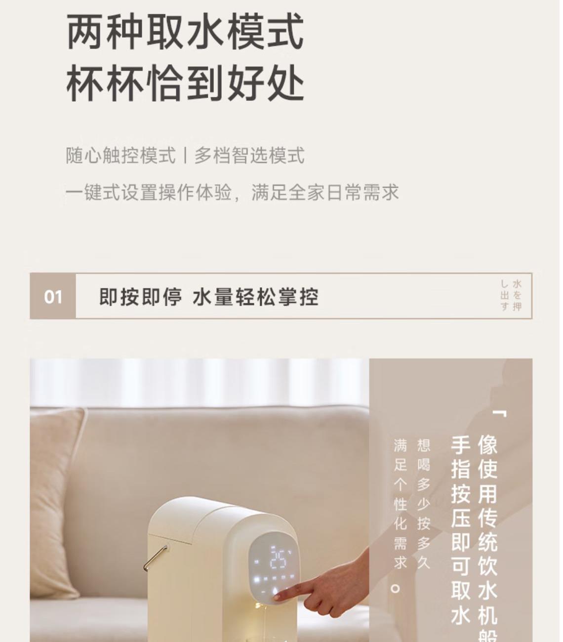 產(chǎn)品重量:約 1.6kg 額定電壓:220V~ 額定頻率:50Hz 額定功率:2000W 產(chǎn)品尺寸:160*150*47mm 316L不銹鋼,母嬰級安心水箱 全水路食品級無雙酚 A 多段定溫模式、±1℃可調(diào)節(jié) 水路安全、食品級材質(zhì)、 0異味,0雙酚A 柔光夜晚氛圍燈 定量取水、輕音制水 即熱式節(jié)能低耗