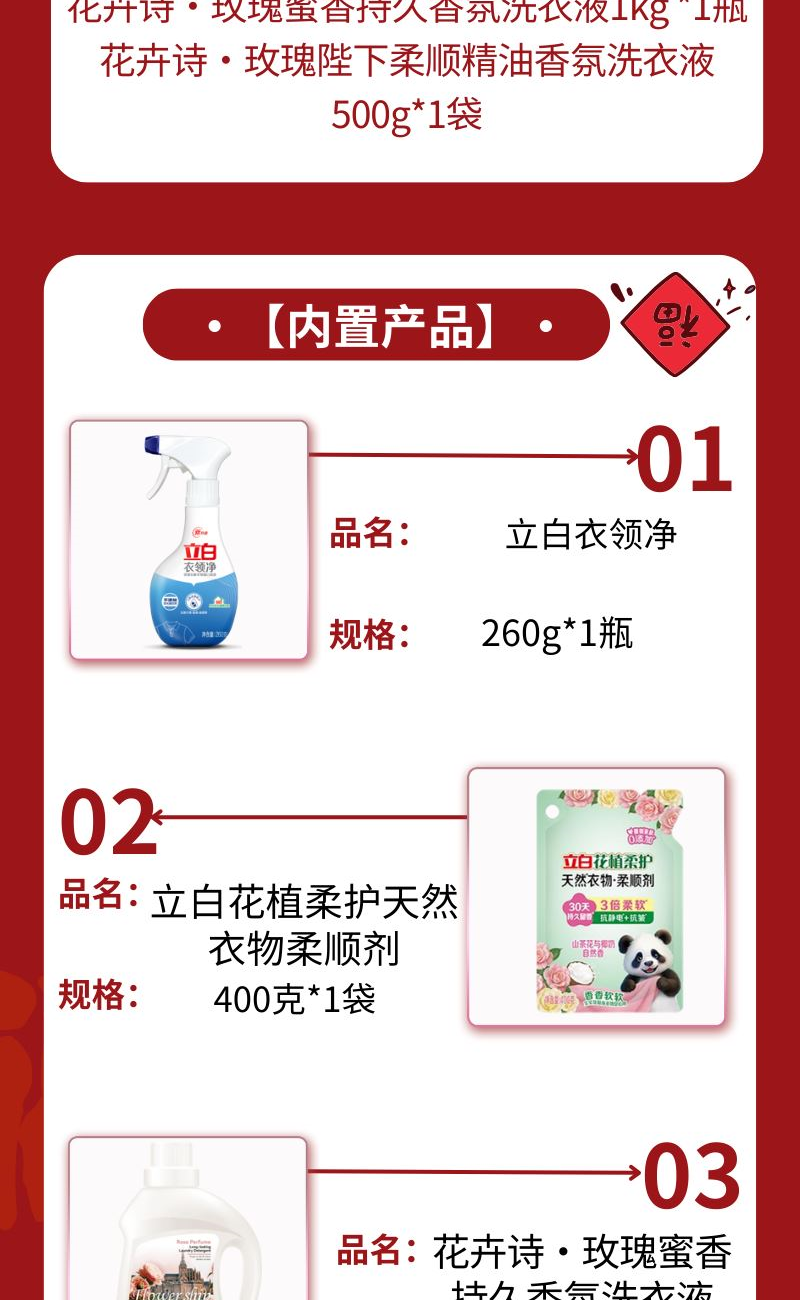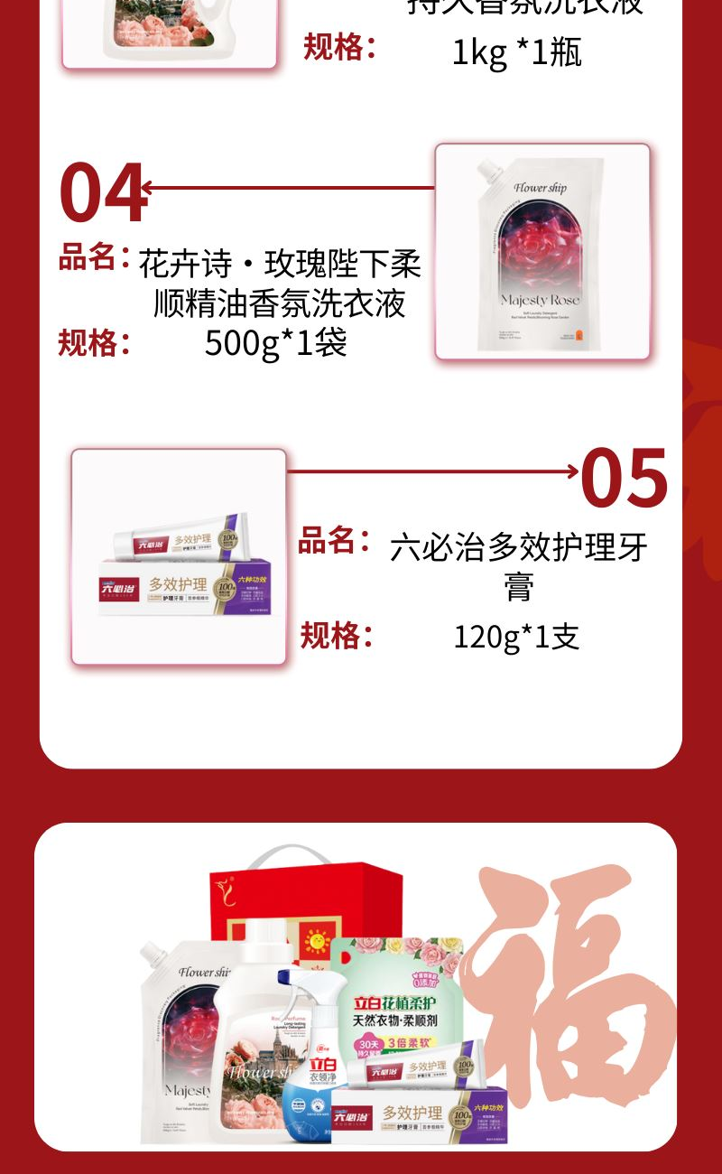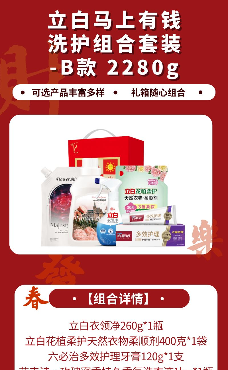 配置: 立白衣領(lǐng)凈260g*1瓶 立白花植柔護(hù)天然衣物柔順劑400克*1袋 六必治多效護(hù)理牙膏120g*1支 花卉詩(shī)·玫瑰蜜香持久香氛洗衣液1kg *1瓶 花卉詩(shī)·玫瑰陛下柔順精油香氛洗衣液500g*1袋 賣點(diǎn): 可選產(chǎn)品豐富多樣,禮箱隨心組合,多種價(jià)位因需而定,充分滿足各種送禮需求,是商務(wù)送禮、單位福利的用心之選。