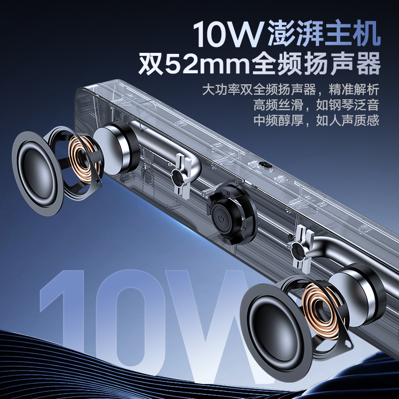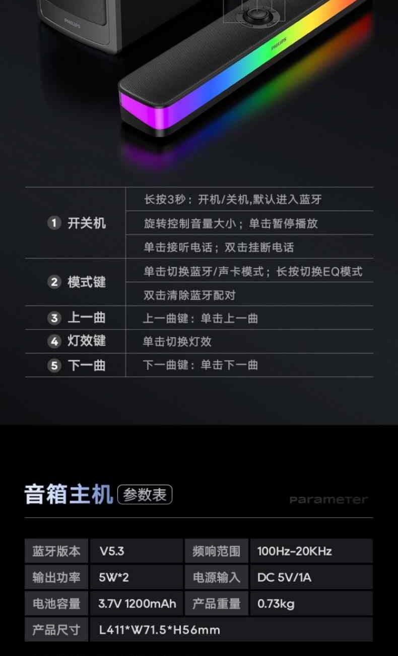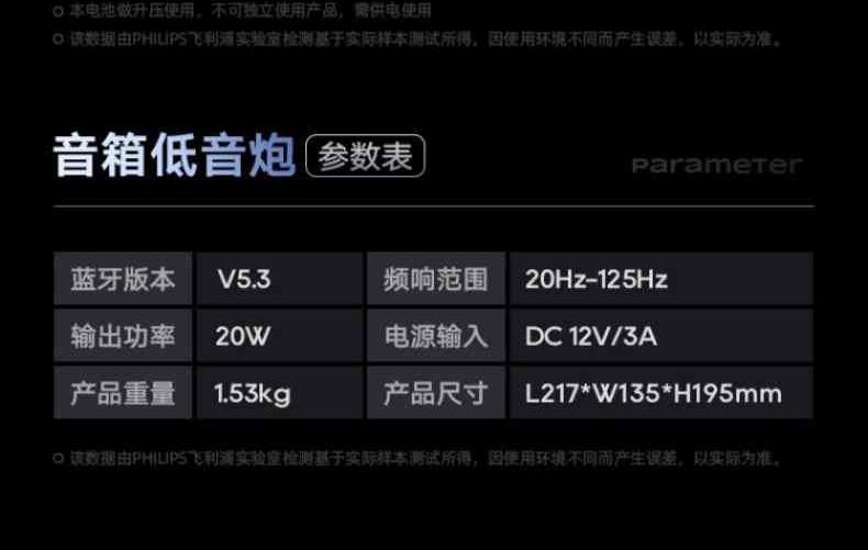 輸出功率:主機(jī)5W*2 低音炮20W 藍(lán)牙:V5.3 喇叭尺寸: 主機(jī)52mm*2 低音炮4英寸 頻響范圍:主機(jī)100Hz-20KHz 低音炮20Hz-125Hz 電池:1200mAh/3.7V (本電池做升壓使用,不可獨(dú)立使用產(chǎn)品,需供電使用)