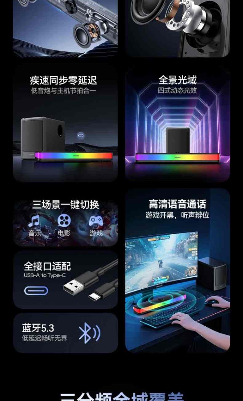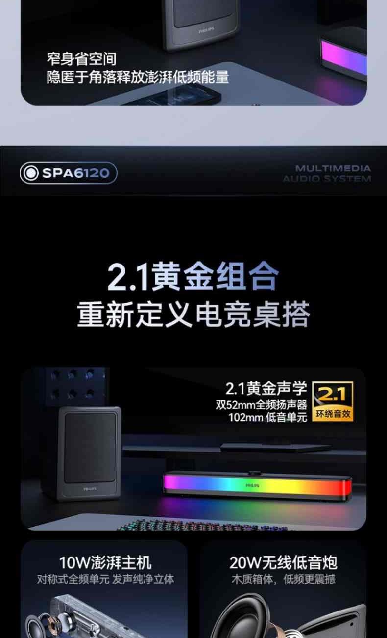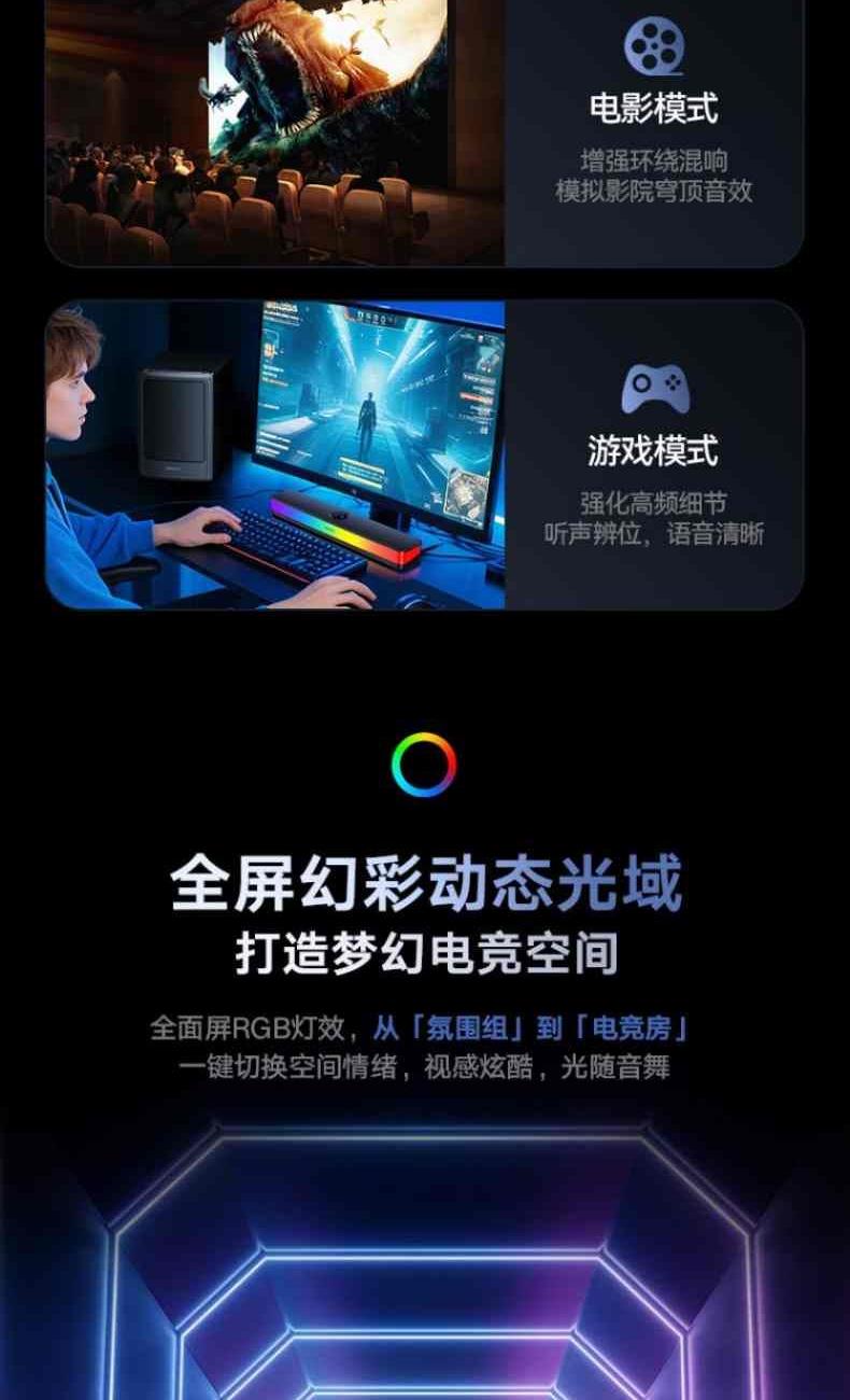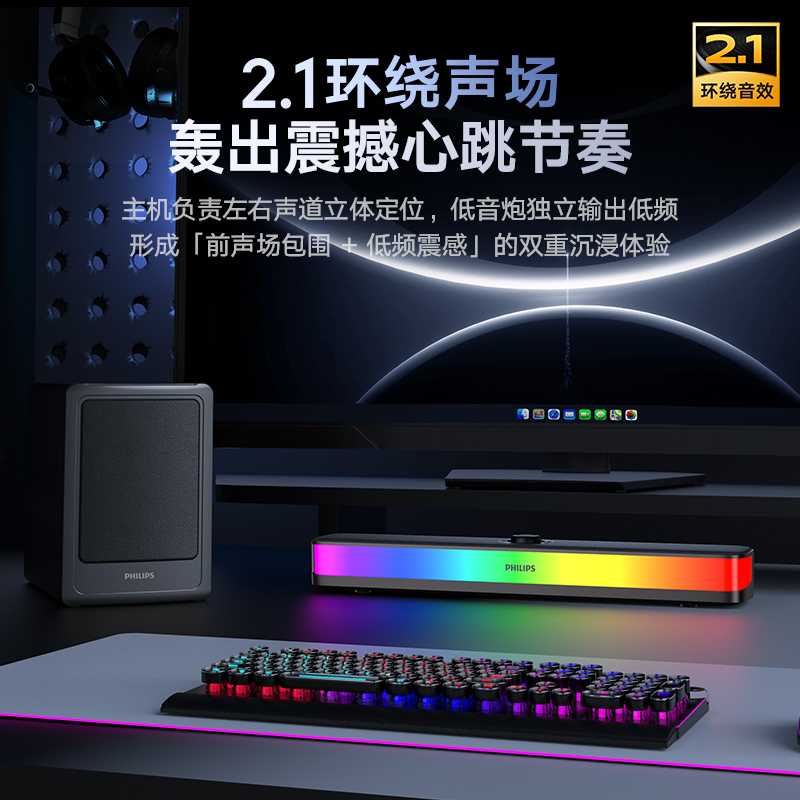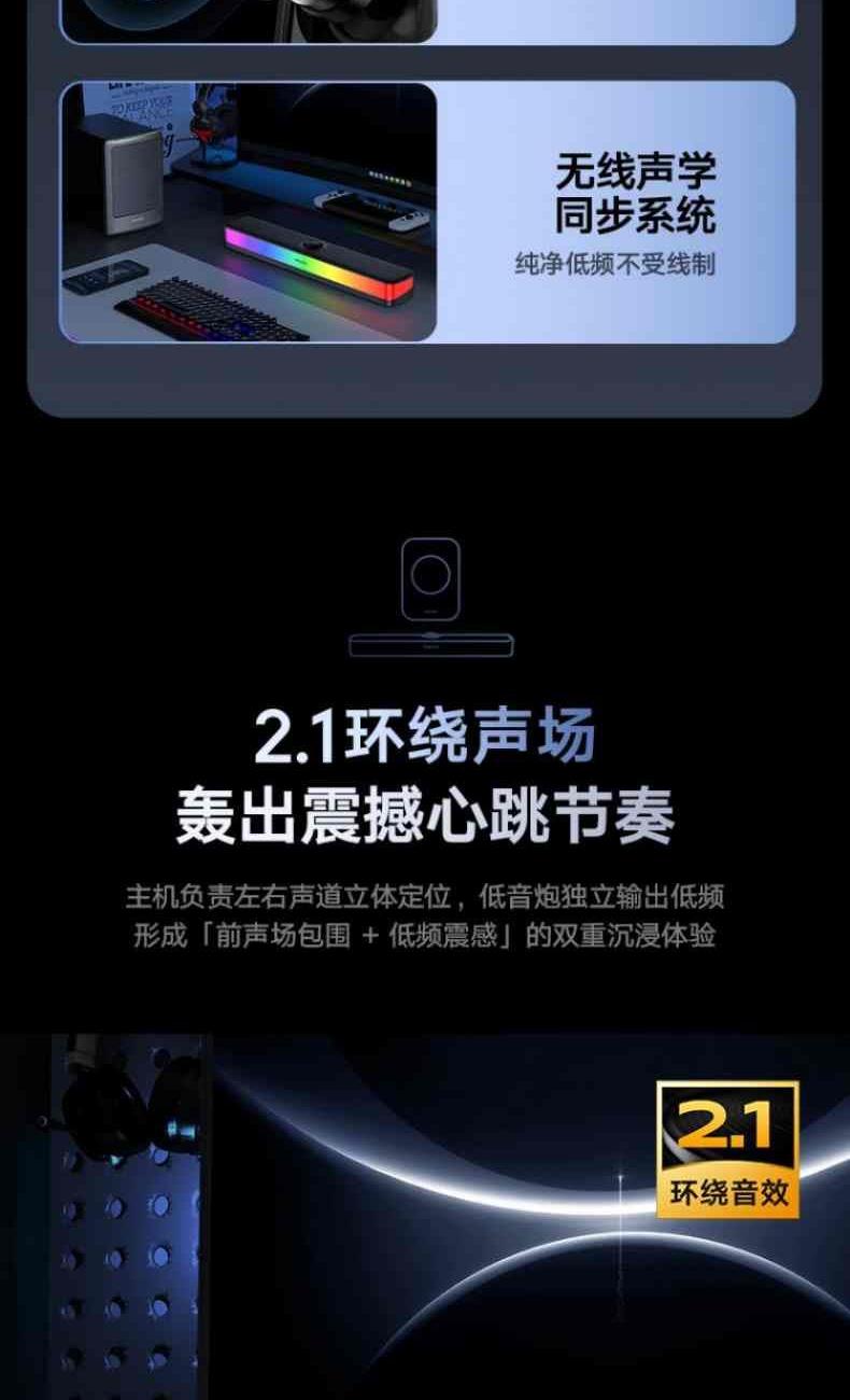 ?2.1環(huán)繞聲場(chǎng),前聲場(chǎng)包圍+低頻震感,雙重沉浸體驗(yàn)