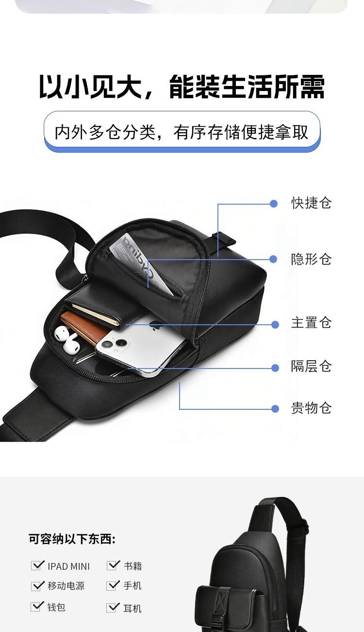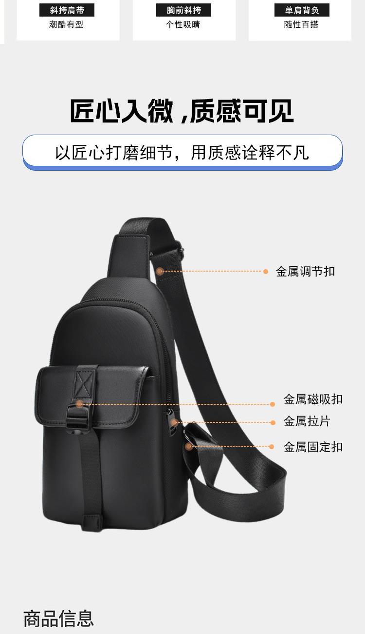 1、小而有范輕潮有型,零感貼身百搭出行 2、合理空間科學布局,解放雙手一包搞定 3、高密牛津防水材質(zhì),柔韌輕盈防刮耐磨 4、多倉分區(qū)收納有序,隨取隨放存取便捷 5、人體工學肩帶設計,多種背法自由選擇 6、金屬配件匠心工藝,入微細節(jié)品質(zhì)在線