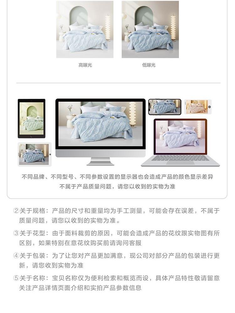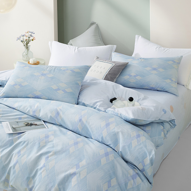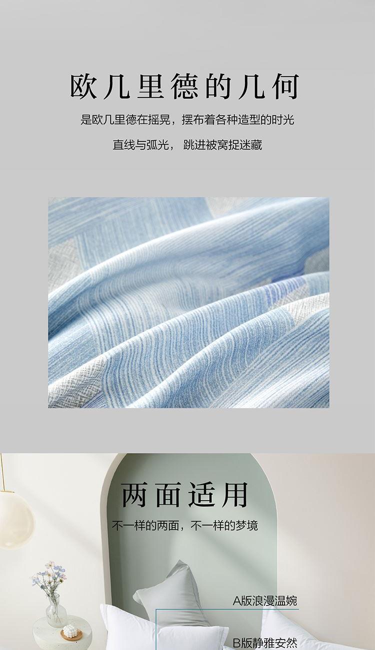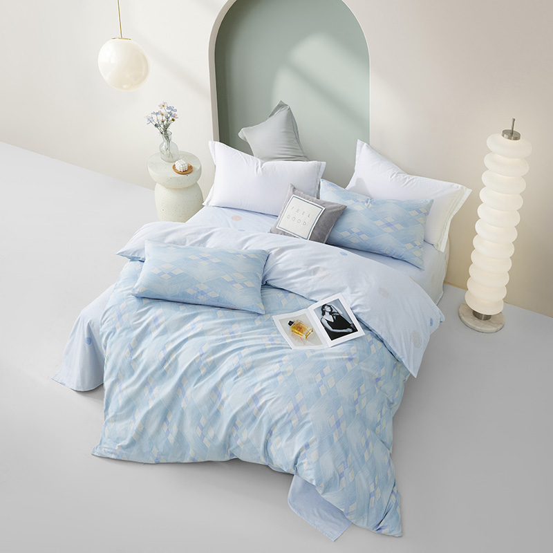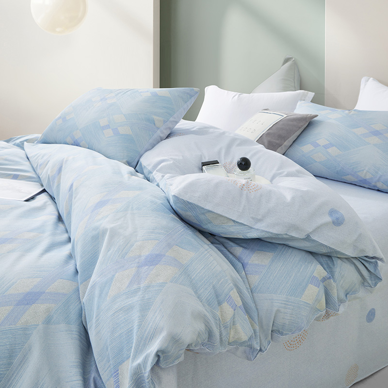 規(guī)格尺寸:枕套:48*74cmX2 被套:220*250cmX1 床單:260*240cmX1 外箱尺寸:54*42*38 cm 采用簡(jiǎn)約現(xiàn)代設(shè)計(jì),淡藍(lán)色調(diào)搭配幾何圖案,營造出寧靜舒適的睡眠環(huán)境。選用優(yōu)質(zhì)面料,柔軟親膚,適合各種季節(jié)使用。 全棉面料親膚舒適,柔軟、吸濕透氣。